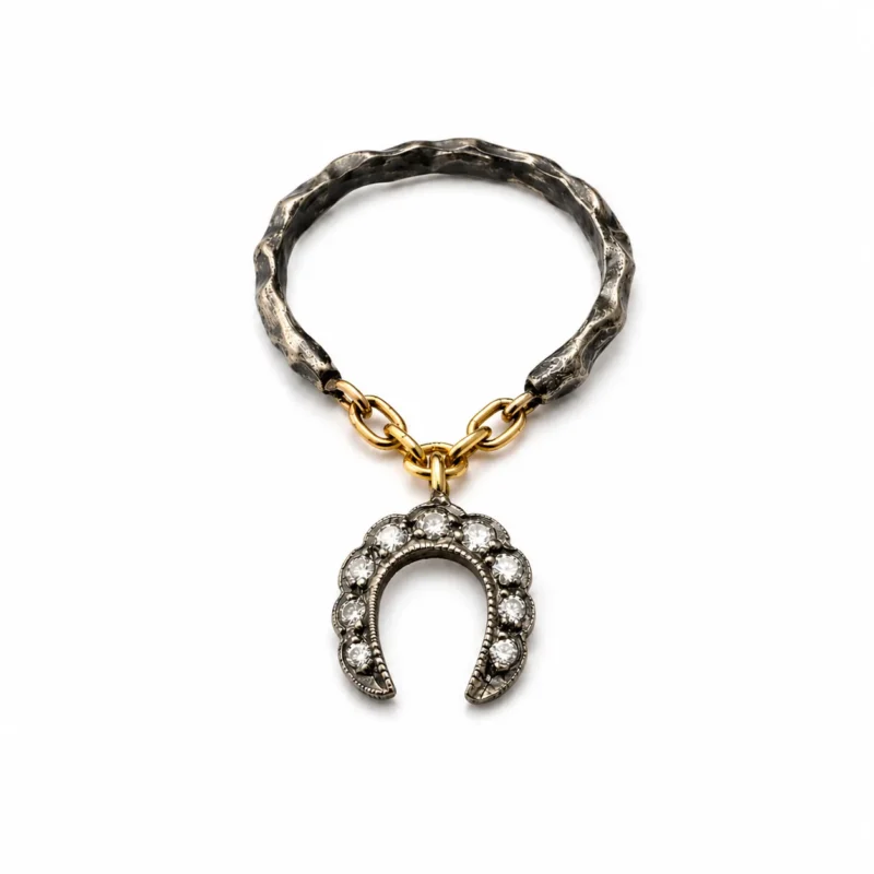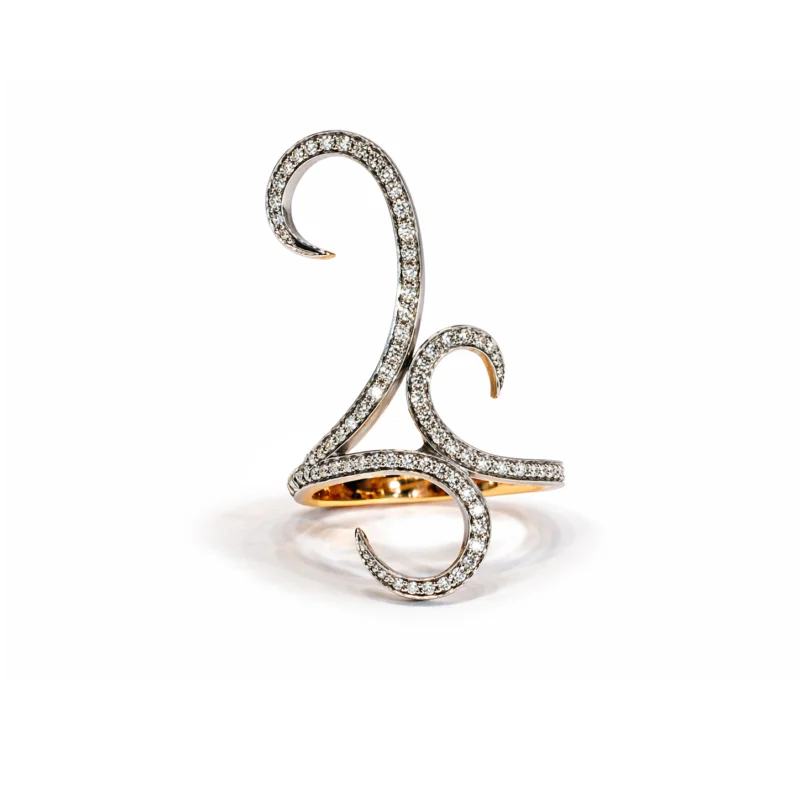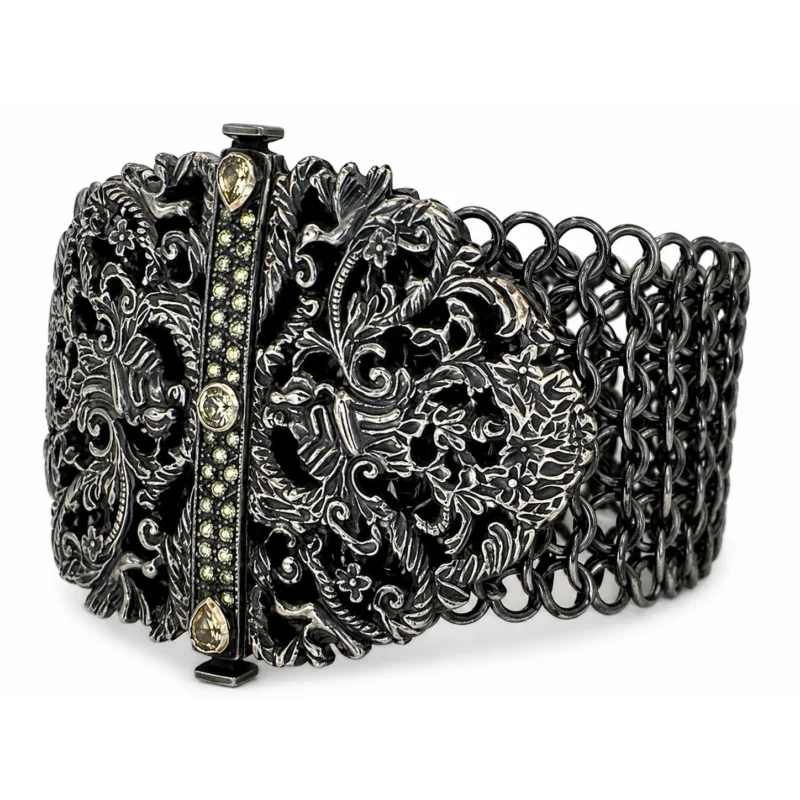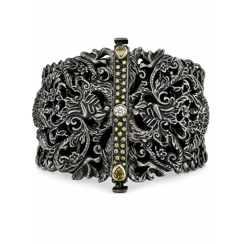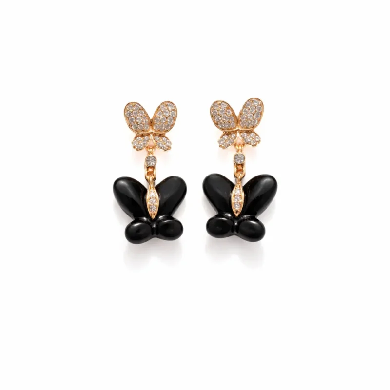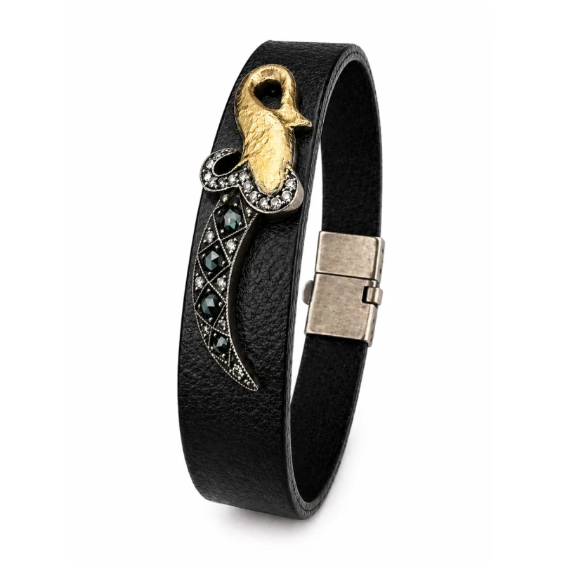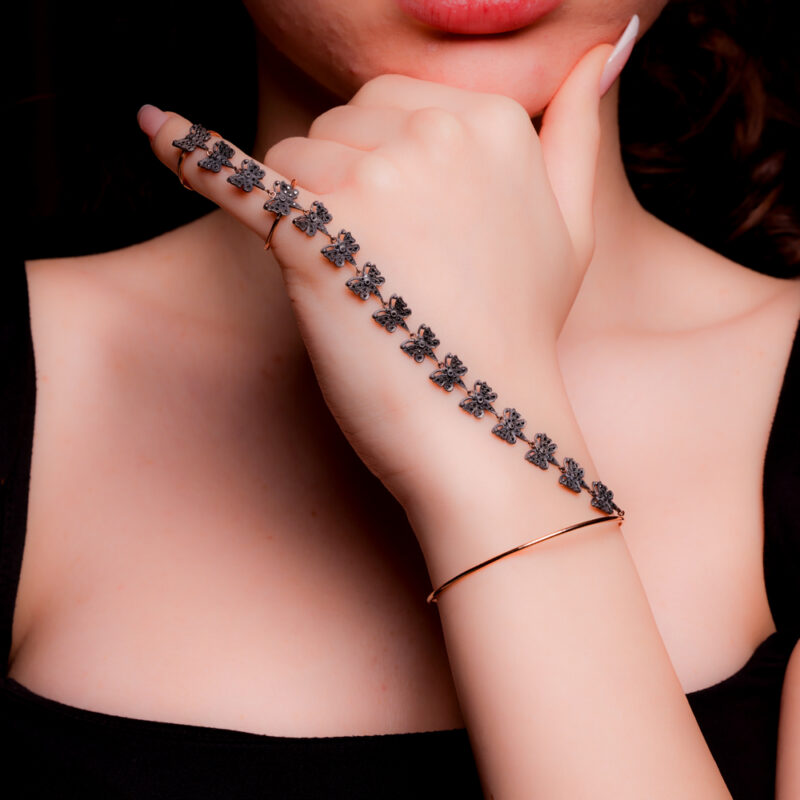 Zarif kelebek motifleriyle tasarlanan bu şahmeran siyah pırlanta detaylarıyla dikkat çekici bir stil sunar.Parmaktan bileğe uzanan akışkan formu elde şık ve farklı bir görünüm oluşturur.İnce altın bileklik ile dengelenen tasarım hem modern hem de feminen bir etki yaratır.