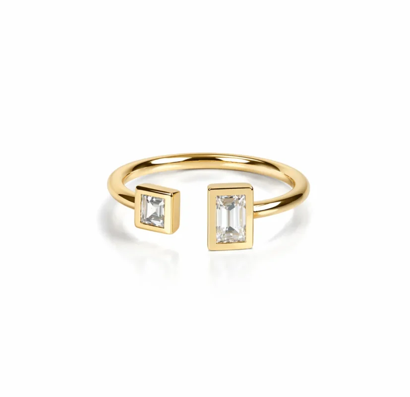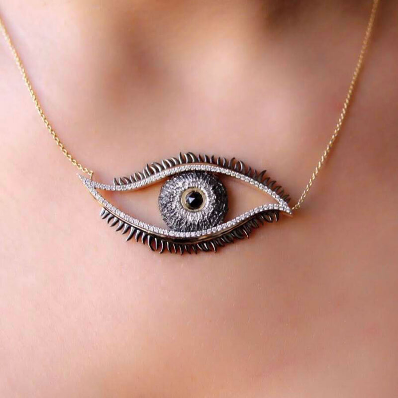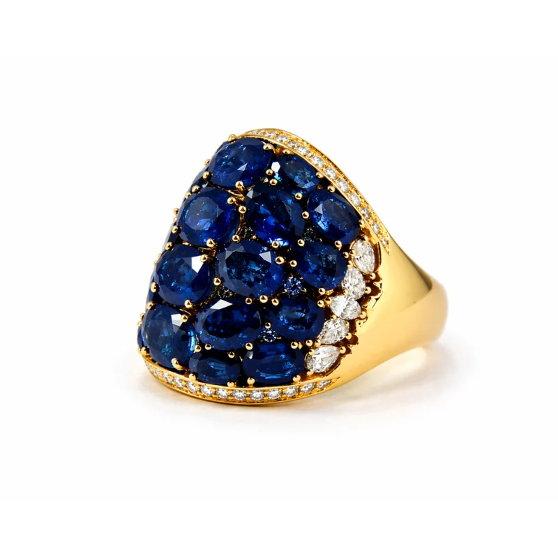 Göz formunda Pırlanta ve Safir detayına ve zarif tek taş vurgusuna sahip bu açık uç yüzük, modern ve sembolik tasarımıyla dikkat çeken şık bir parçadır.