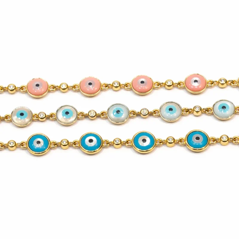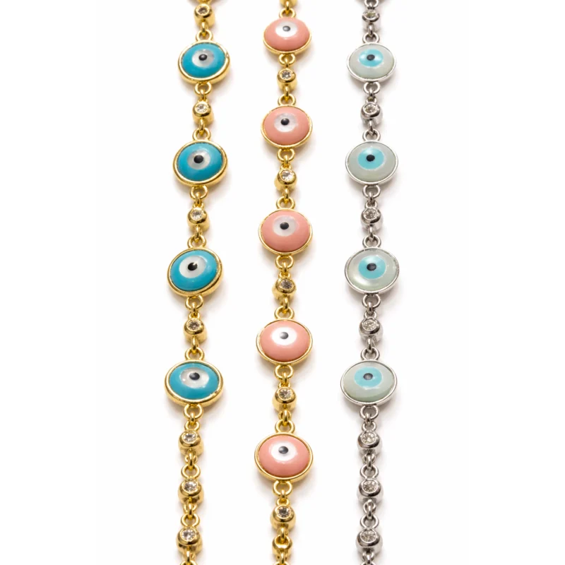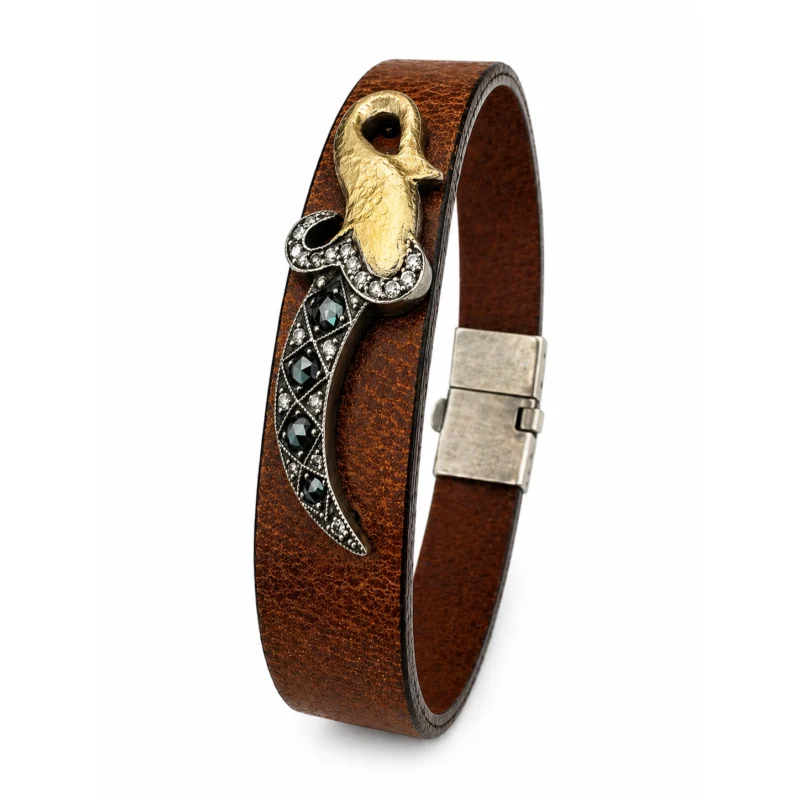 Kahverengi Deri Bileklik Safir ve Pırlanta Taşlı Nazarlık Detaylı