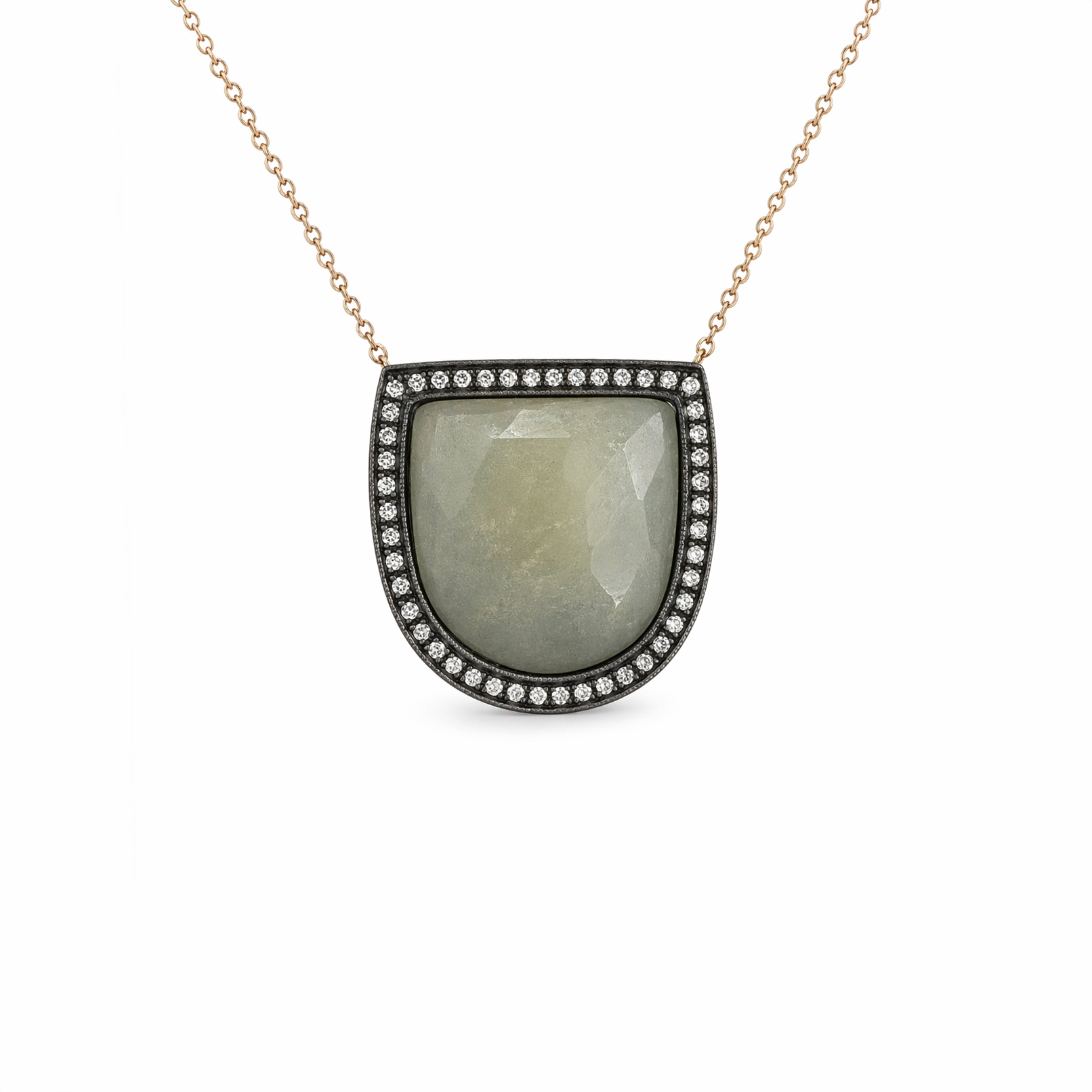 Etrafını saran pırlanta detaylı çerçeve, taşın zarif tonunu ön plana çıkarırken ince bir parlaklık katmanı ekler. Altın zincir ile tamamlanan tasarım, boyun üzerinde dengeli ve dikkat çekici bir duruş sağlar.