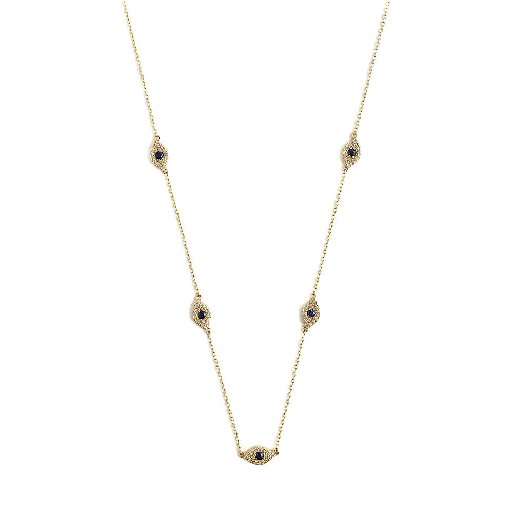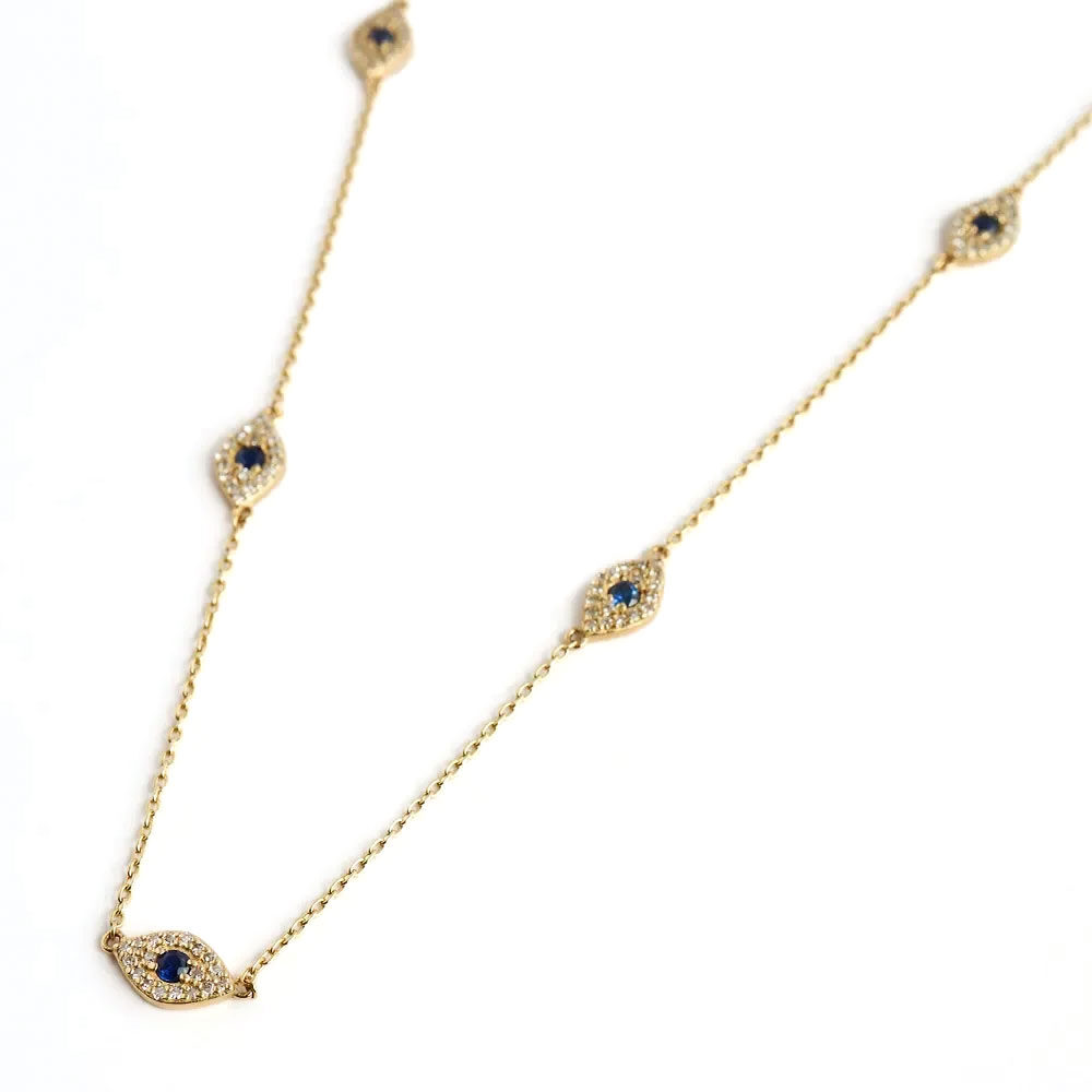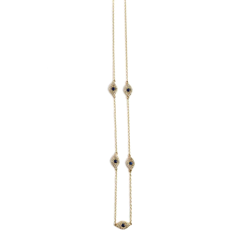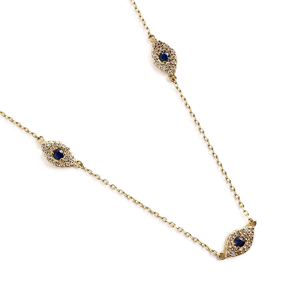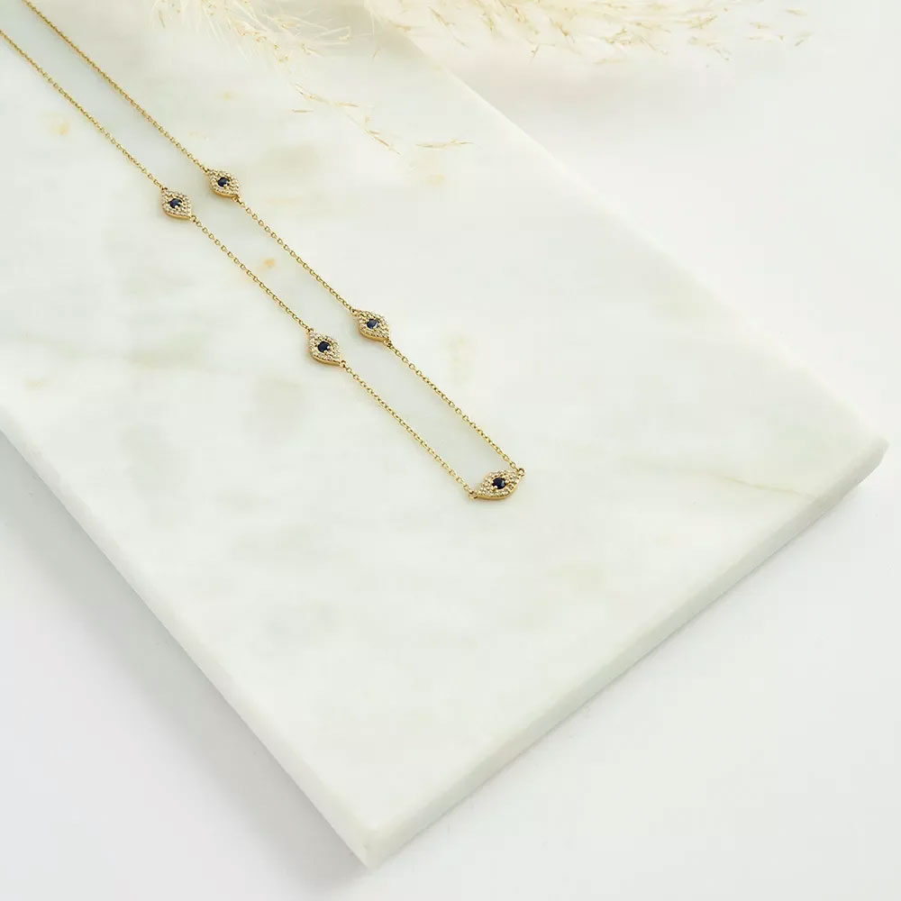 Zarif ve anlam yüklü tasarımıyla öne çıkan bu nazar boncuklu kolye, minimal şıklığı modern bir dokunuşla birleştiriyor. İnce altın zincir üzerine yerleştirilmiş göz formundaki detaylar ve lacivert safir dokunuşları, kolyeye hem estetik hem de koruyucu bir sembol anlamı katıyor.