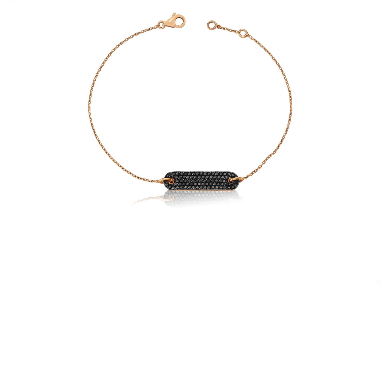 Modern çizgileriyle öne çıkan bu altın zincir bileklik, merkezinde yer alan siyah pırlanta taşlarla bezeli plak formu ile dikkat çeker. Yoğun taş dizilimi, tasarıma derinlik ve güçlü bir karakter kazandırırken, ince altın zincir ile dengeli ve zarif bir görünüm sunar. Minimal formuna rağmen etkileyici bir duruş sergileyen bu bileklik, hem günlük kullanımda hem de özel anlarda stilinizi tamamlayan şık bir aksesuardır.