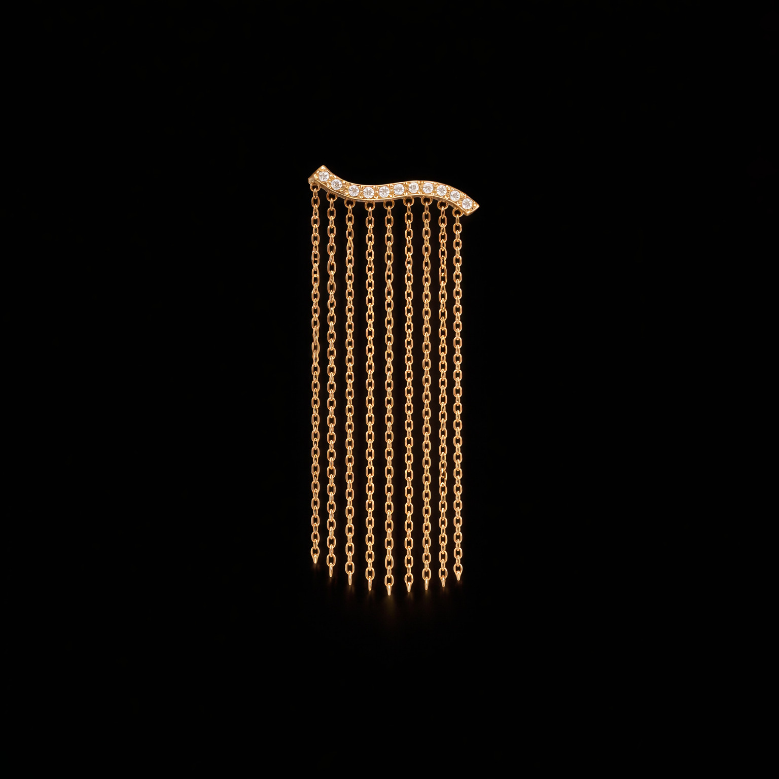 Altın tonun sıcaklığı, çoklu zincir püskül tasarımıyla hareket kazanır. Üst bölümde yer alan pırlanta detaylar, tasarıma zarif bir ışıltı eklerken küpenin akışkan formunu öne çıkarır. Modern ve dikkat çekici çizgisiyle tek küpe kullanımını farklı bir seviyeye taşır.
