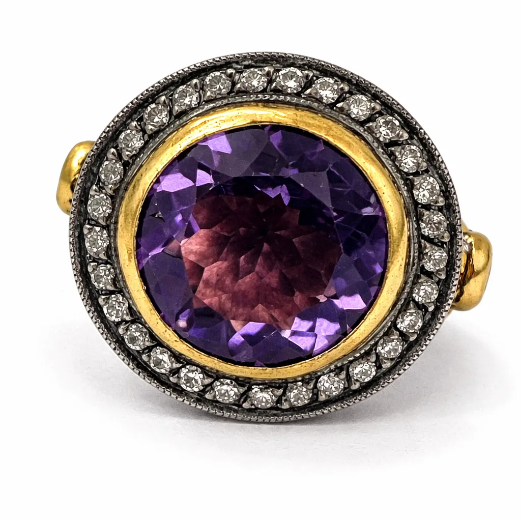 Merkezinde yer alan göz alıcı ametist taşı ile dikkat çeken bu yüzük, zarafet ve ihtişamı bir araya getiriyor. Derin mor tonlarıyla ışığı büyüleyici şekilde yansıtan ametist, çevresini saran pırlanta taşlarla daha da ön plana çıkıyor.