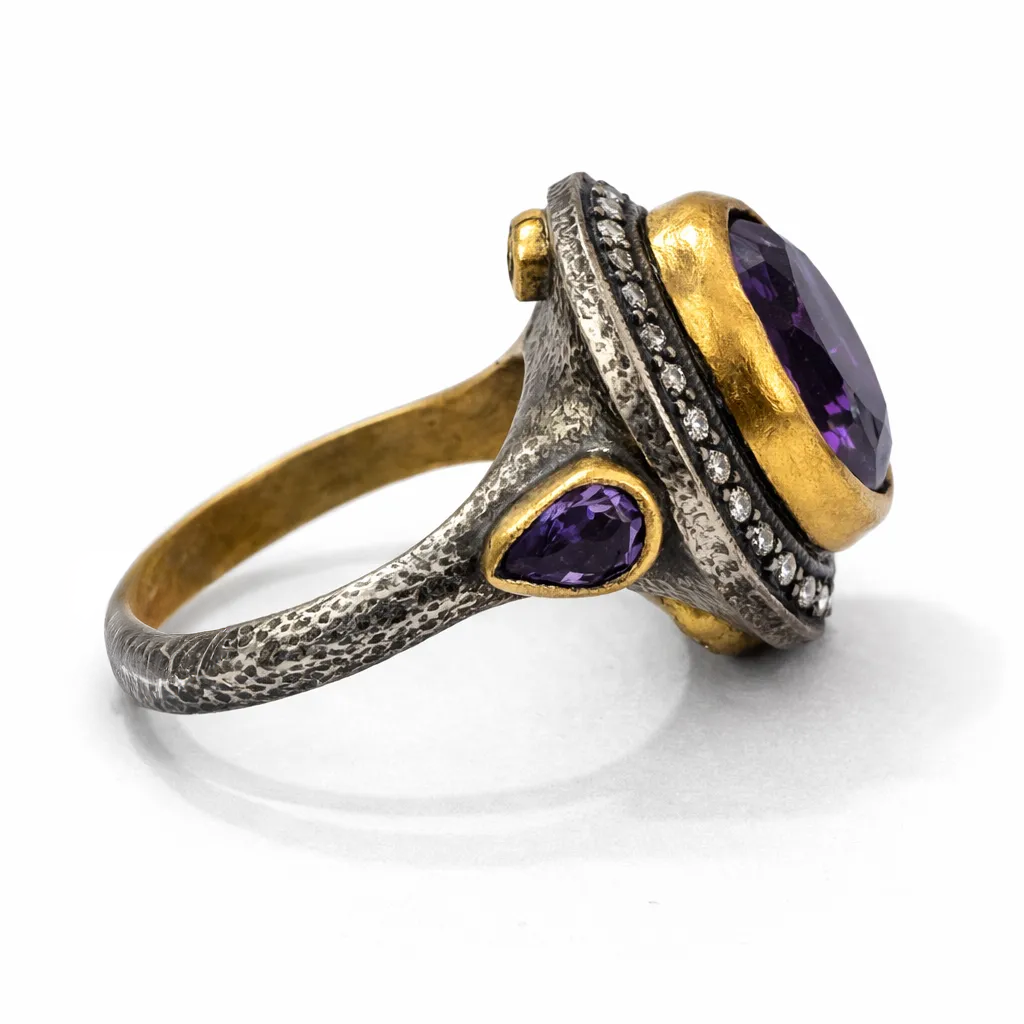 Altın çerçeve detayı ve oksitli gümüş dokunun birleşimi, tasarıma vintage ve sofistike bir karakter kazandırırken; yan kısımdaki küçük ametist taşı, bütünlüğü tamamlayan ince bir dokunuş sunuyor.