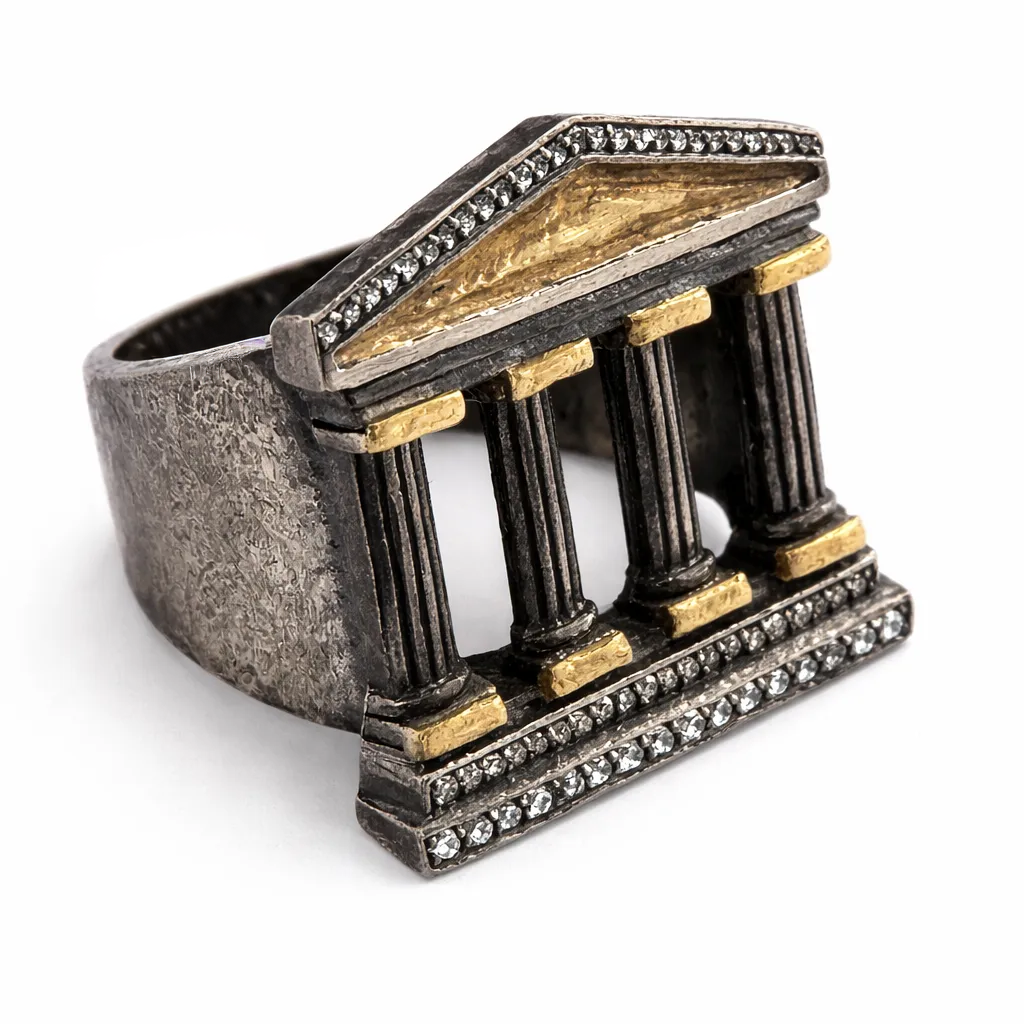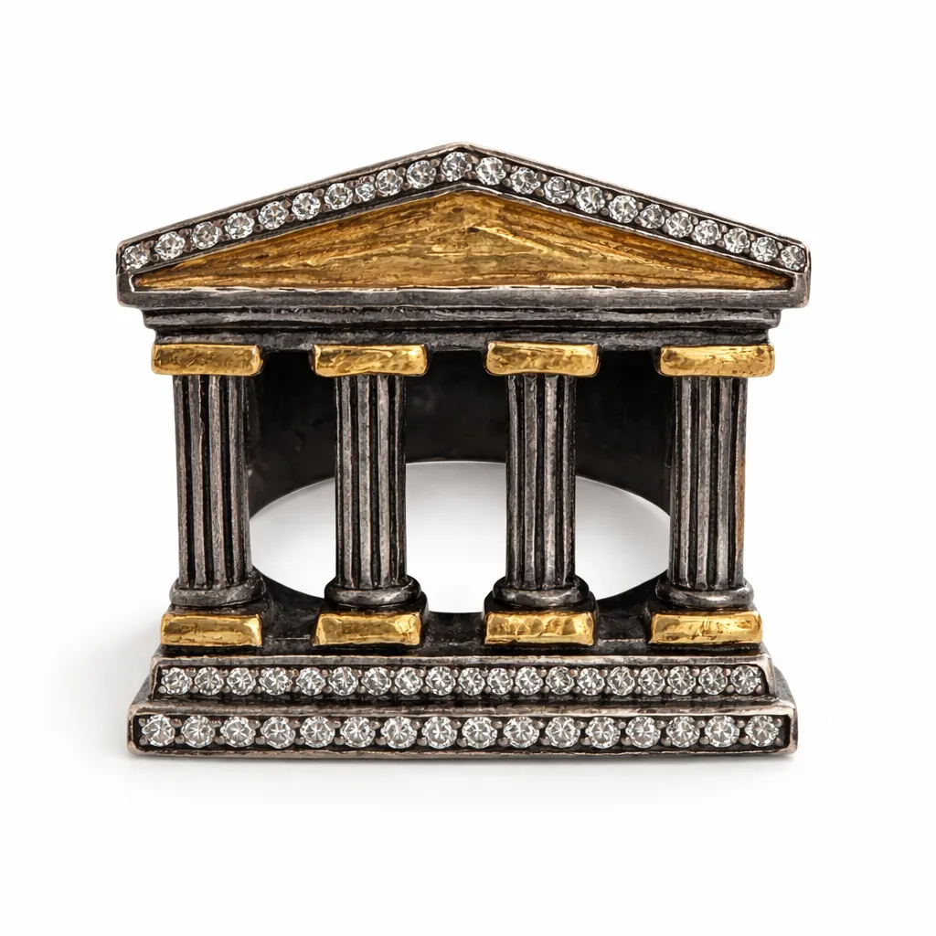Mimari estetikten ilham alan bu özgün yüzük, antik tapınak formunu zarif bir mücevher tasarımına dönüştürüyor. Sütun detayları ve üçgen alınlık formu, güçlü ve simetrik bir yapı sunarken, yüzey boyunca yer alan pırlantalar tasarıma etkileyici bir ışıltı kazandırır.
