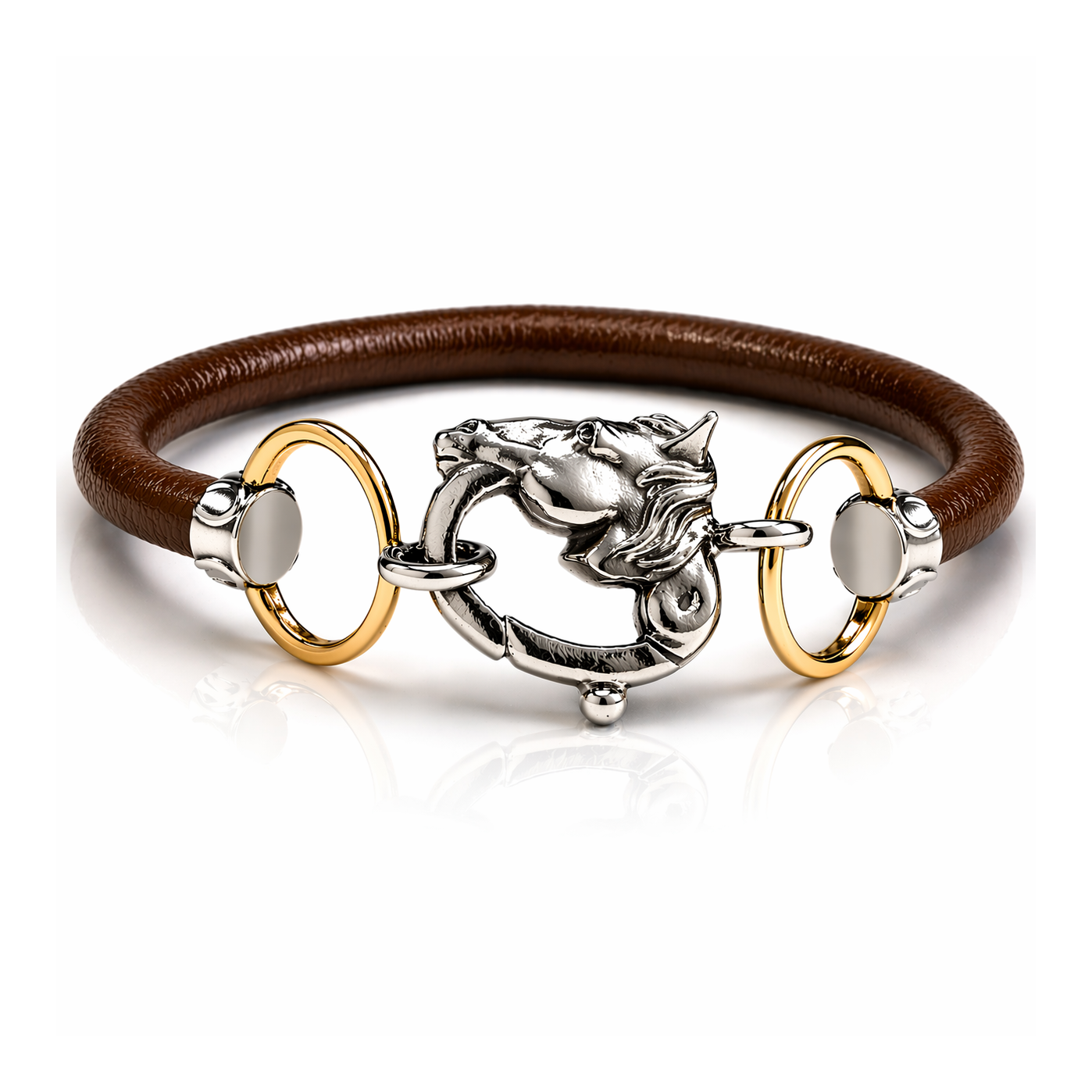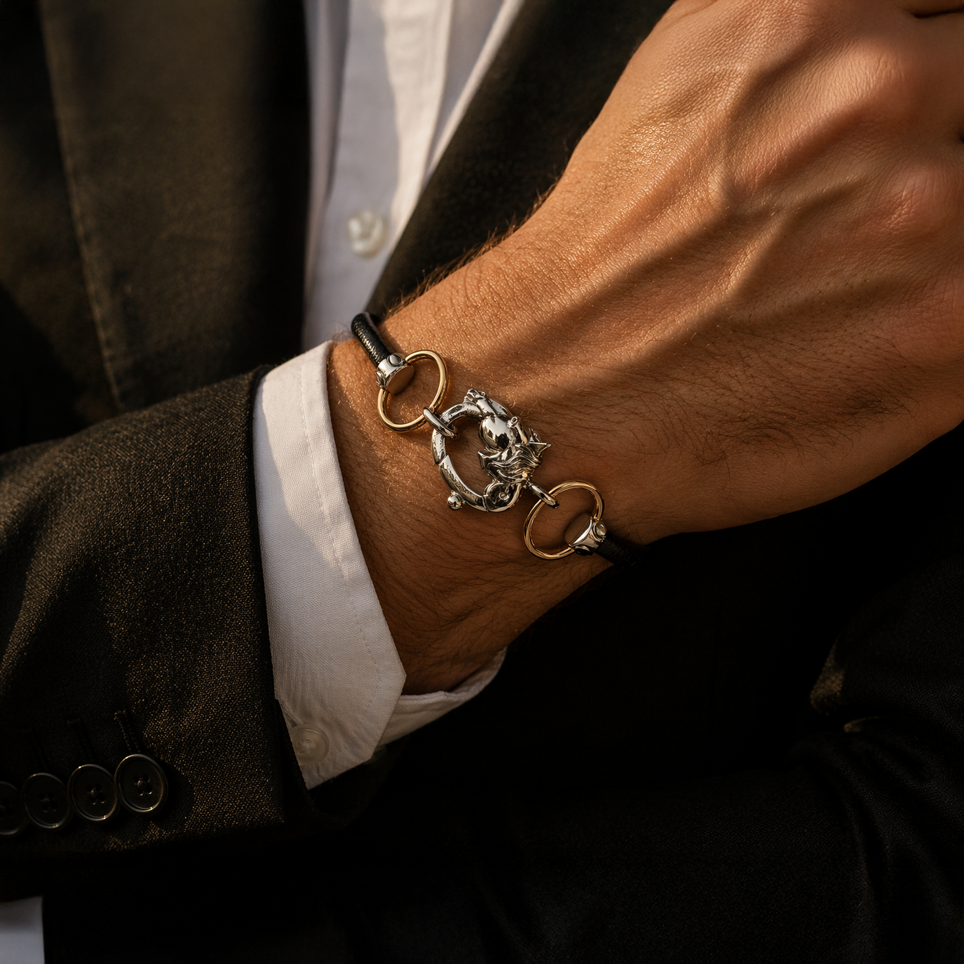 Güç ve özgürlüğün simgesi olan at figürü, bu bileklikte modern ve karakterli bir tasarımla hayat bulur. Metal detayların güçlü duruşu, kahverengi deri kordon ile birleşerek maskülen ve dikkat çekici bir stil oluşturur.