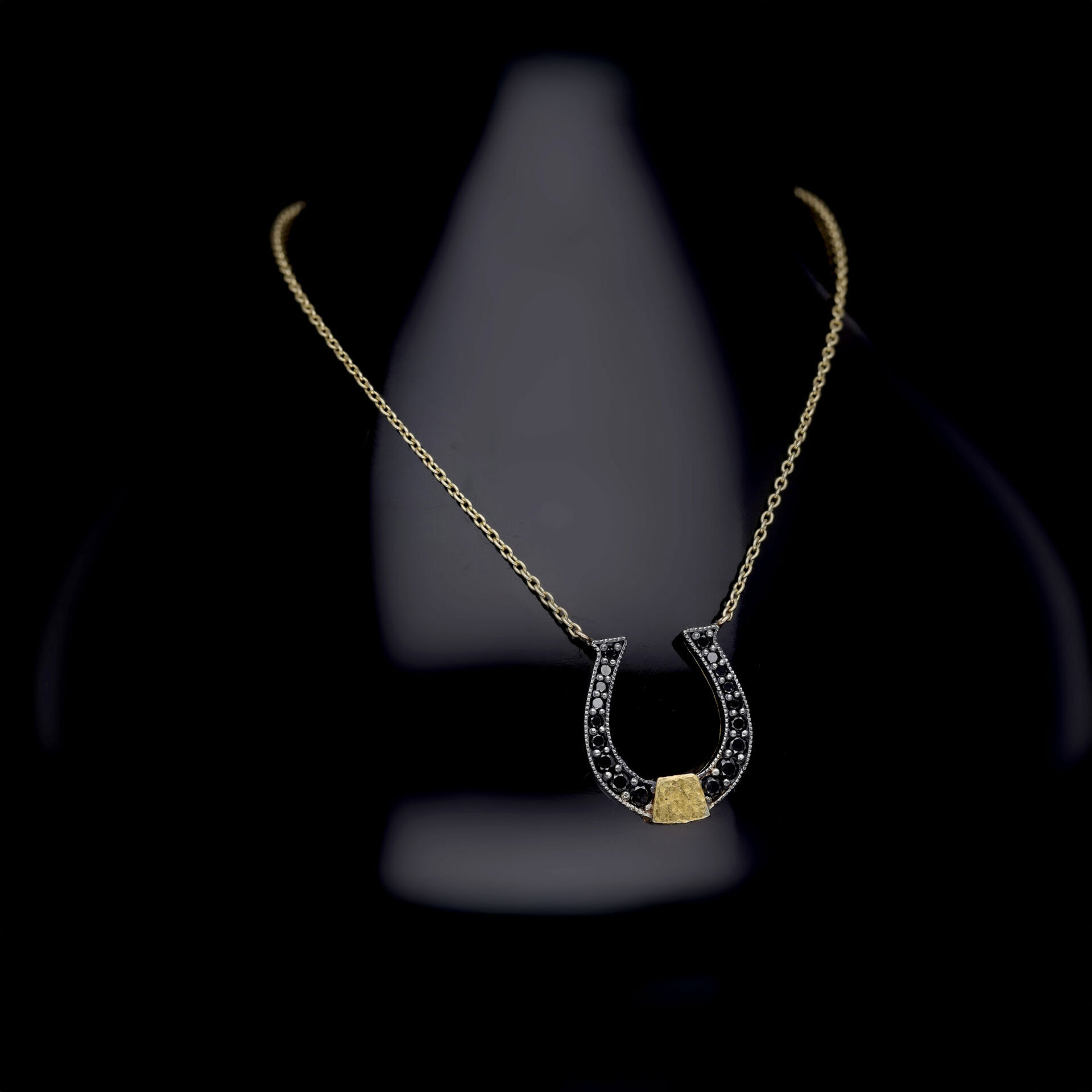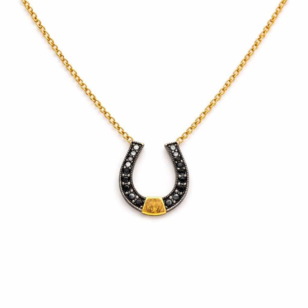 Şans ve korumayı simgeleyen at nalı formu, bu özel tasarım kolyede modern ve sofistike bir yorumla hayat buluyor. Siyah pırlantaların güçlü ve derin ışıltısı, tasarıma karakteristik bir görünüm kazandırırken altın detay ile dengeli bir kontrast oluşturur.