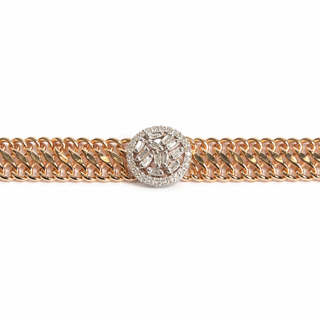 Kalın zincir formu ve merkezde yer alan baget pırlanta detaylı yuvarlak tasarımıyla öne çıkan bu bileklik, güçlü ve dikkat çekici bir stil sunar. Altın zincirin parlak yapısı, ortadaki baget kesim pırlantalarla birleşerek dengeli bir ışıltı oluşturur. Modern ve iddialı tasarımı sayesinde hem günlük kullanımda hem de özel anlarda stilini tamamlayan etkili bir parçadır. Bilekte güçlü bir duruş sergileyen bu tasarım, sade kombinleri bile ön plana çıkarır.