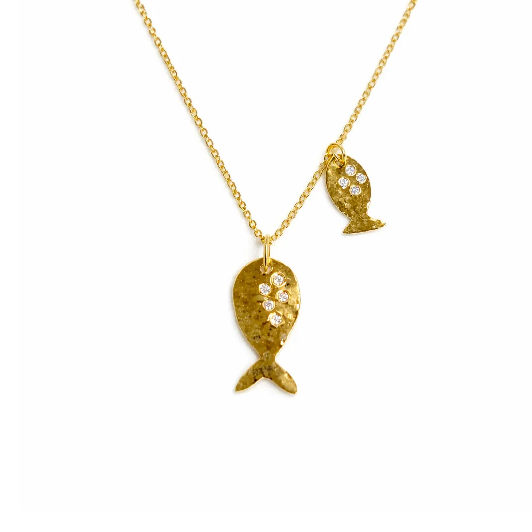 Doğadan ilham alan bu özel tasarım, balık figürüyle zarif ve anlamlı bir stil sunar. Mat dokulu altın yüzey üzerine yerleştirilen pırlanta detaylar, kolyeye ışıltılı ve özgün bir karakter kazandırır.
