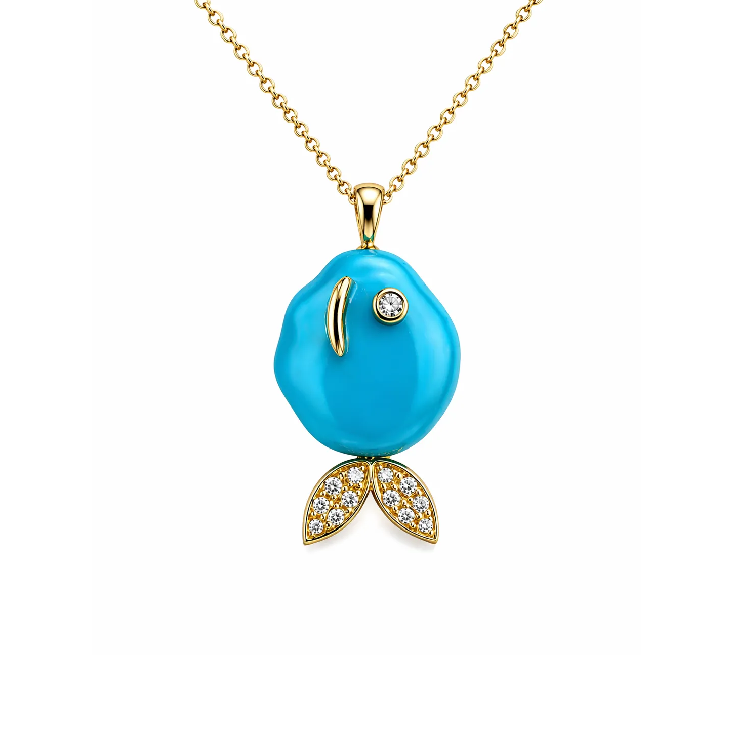 Canlı turkuaz tonu ile dikkat çeken bu firuze taşlı balık kolye, modern tasarım ile sembolik anlamı bir araya getirir. Pürüzsüz ve parlak yüzeye sahip firuze taş, güçlü renk etkisiyle öne çıkarken, altın detaylarla dengeli bir görünüm sunar.