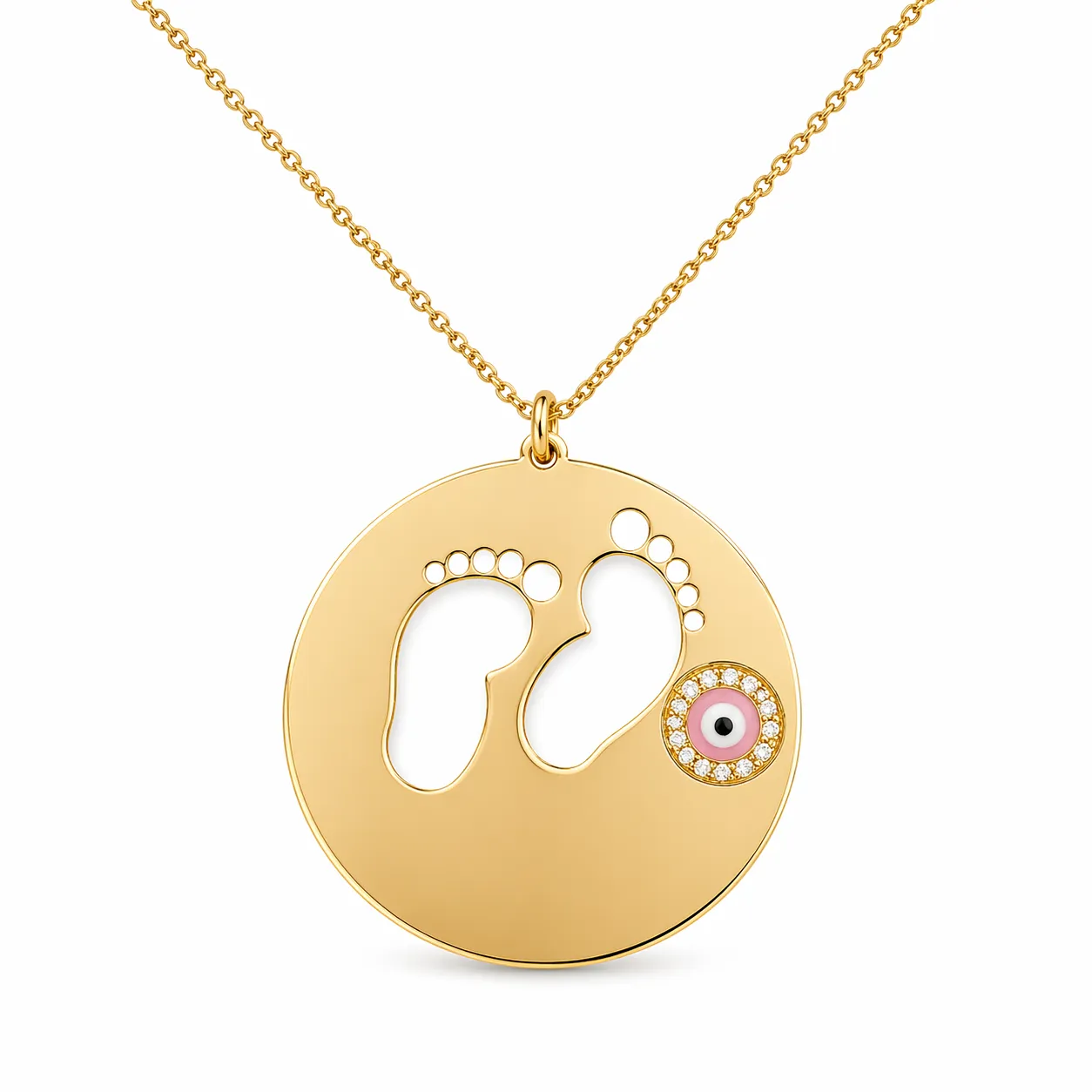 Yeni başlangıçların en saf halini yansıtan bebek ayak izi kolye, duygusal değeri yüksek özel bir tasarımdır. Parlak altın yüzey üzerine işlenen ayak izi formu, anne-çocuk bağını simgeler ve kişisel bir anlam taşır.