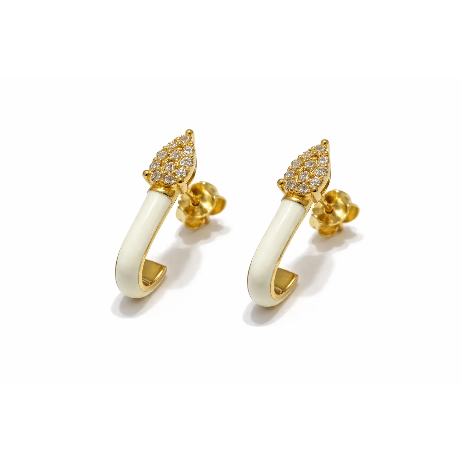 Beyaz mine yüzey ve pırlanta detayların uyumuyla tasarlanan bu halka küpe, temiz ve dikkat çekici bir görünüm sunar. Kavisli mine formu kulağı zarif şekilde sararken, üst kısmındaki pırlanta taşlar tasarıma ışıltı katar. Günlük kombinlerde kolayca kullanılabilir, sade stilleri tamamlayan şık bir parçadır. Hafif yapısı sayesinde gün boyu konfor sağlar ve farklı tarzlarla rahatlıkla uyum yakalar.