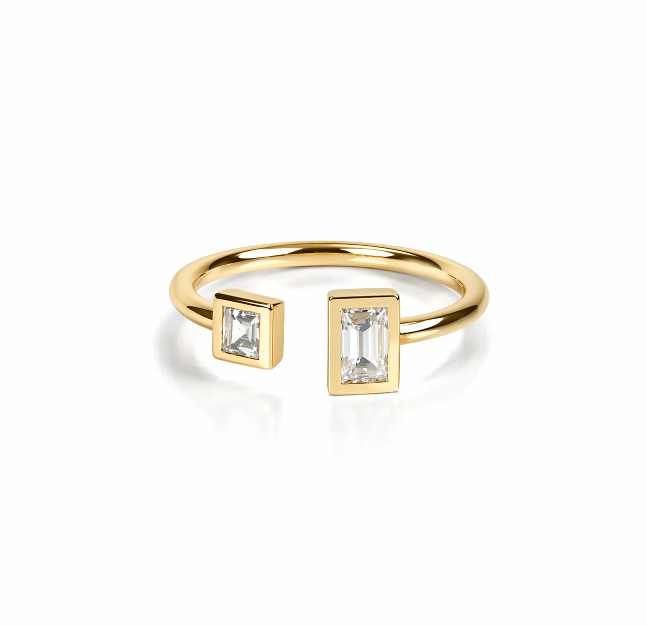 Modern tasarım anlayışının zarif bir yansıması… Bu açık form altın yüzük, biri kare diğeri dikdörtgen baget kesim pırlantalar ile dengeli ve sofistike bir görünüm sunar.