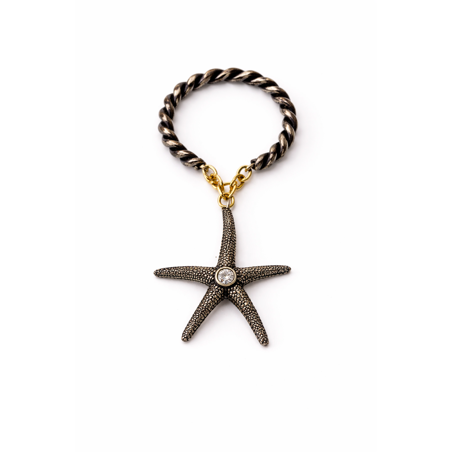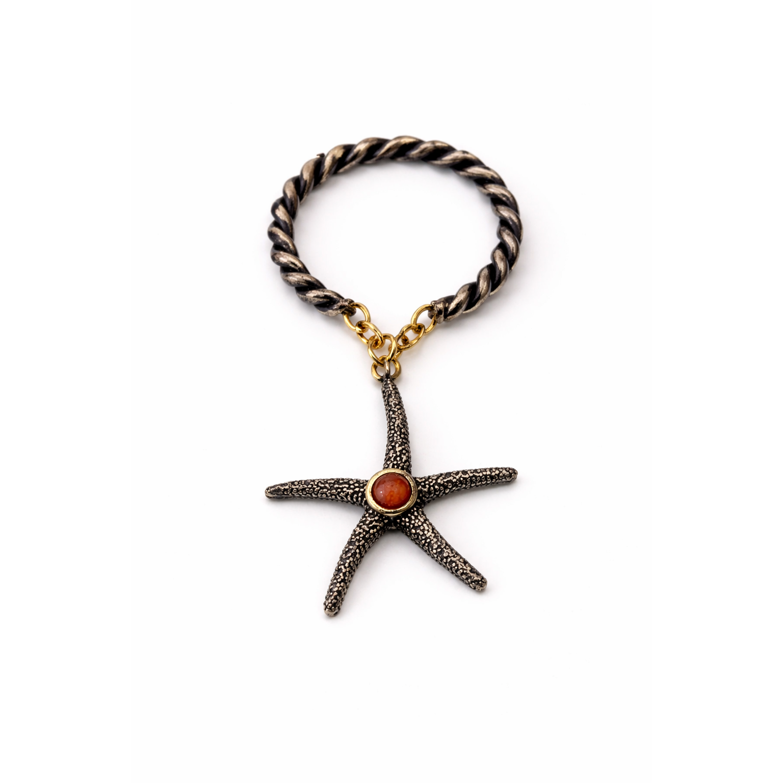 Detaylı yüzey dokusu, deniz yıldızının doğal formunu gerçekçi şekilde yansıtırken, merkezdeki taş kompozisyonu tasarıma güçlü bir karakter kazandırır. Burgulu halka formu ve altın bağlantı detayları ise modern ve artisanal bir görünüm sağlar.