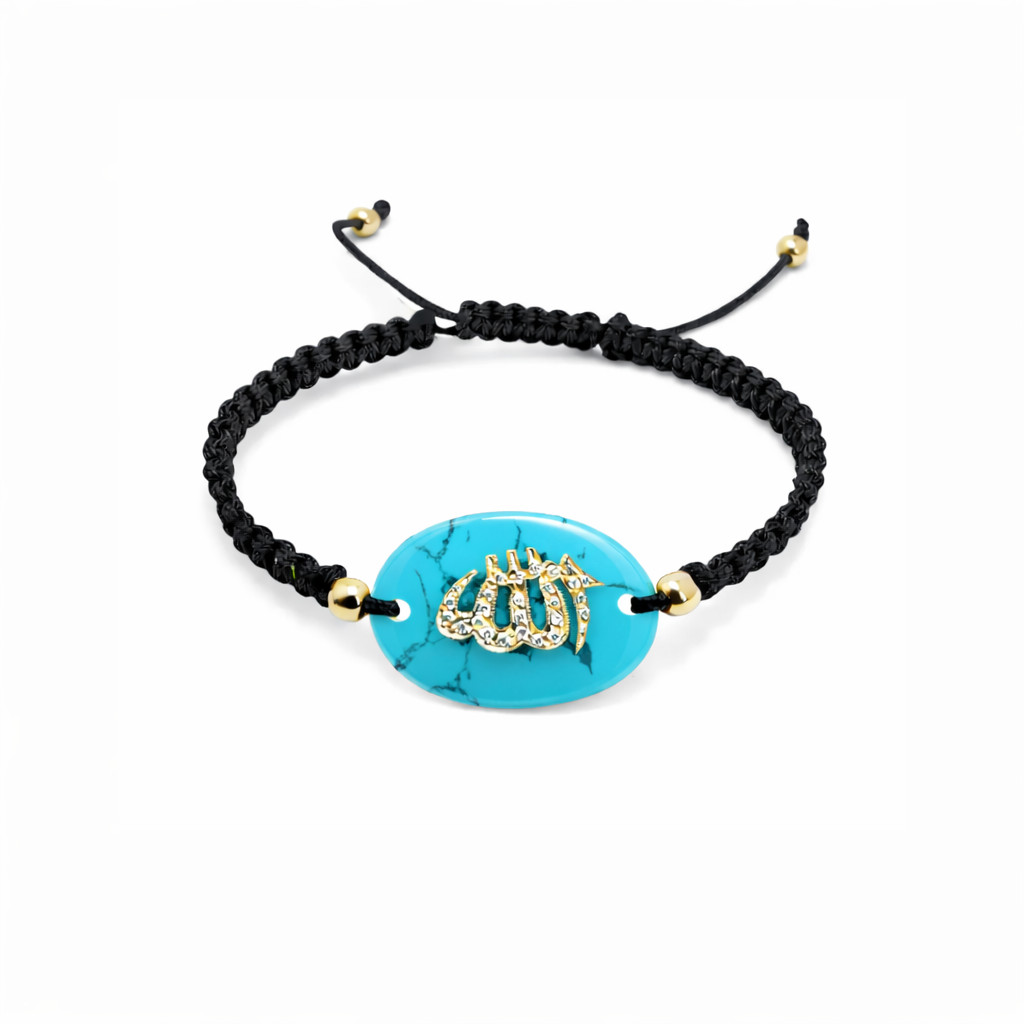 Damarlı Firuze üzerine Allah yazılı altın detaylı ayarlanabilir ip bileklik modeli. Şık ve anlamlı tasarımıyla dikkat çeken özel bir dini bileklik.