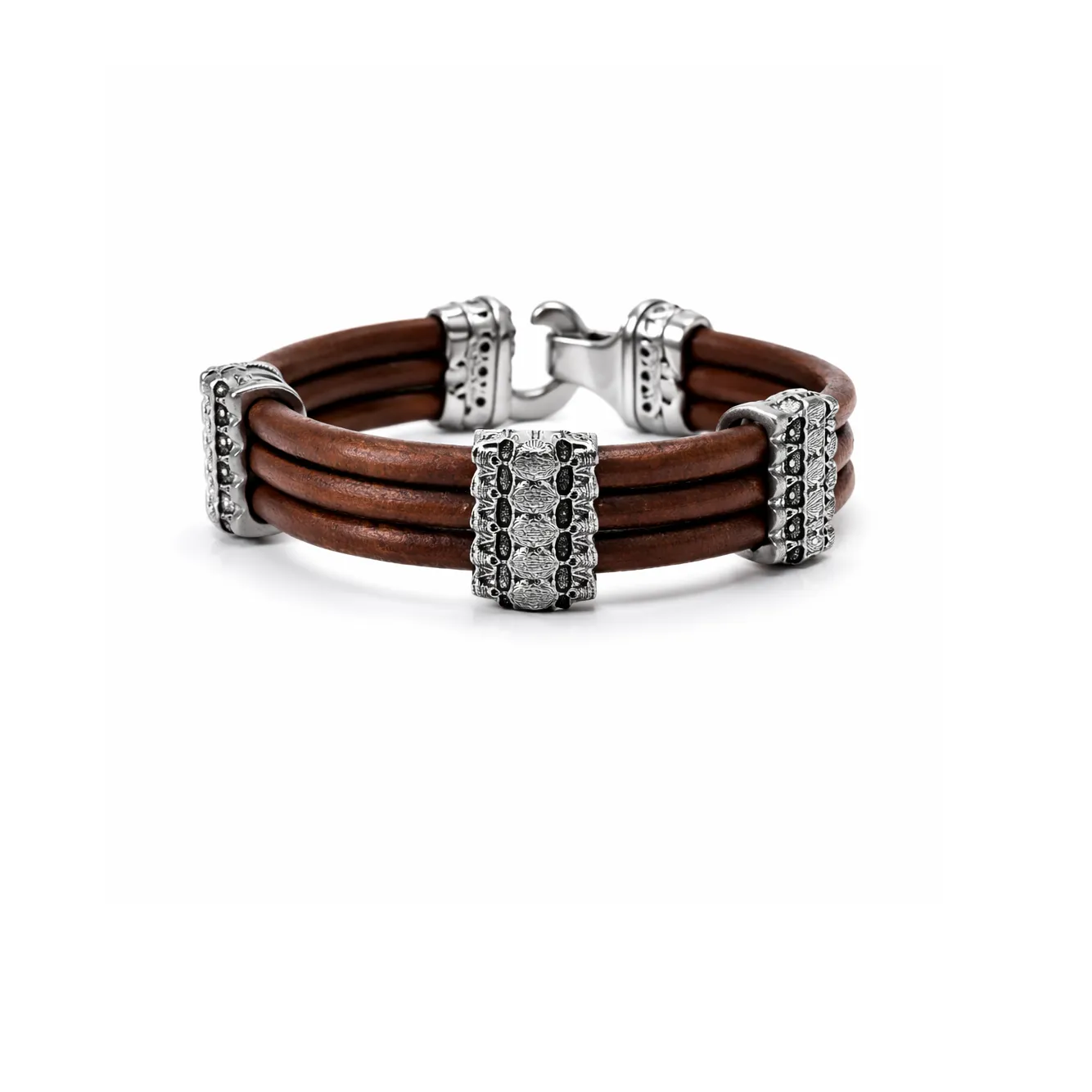 Modern ve maskülen tasarımıyla öne çıkan bu erkek bileklik, çok sıralı kahverengi deri şeritleri ve gümüş kurukafa detaylı parçalarıyla güçlü bir stil sunar. Derinin doğal dokusu ile gümüşün parlak yüzeyi arasındaki kontrast tasarıma sofistike bir görünüm kazandırır.