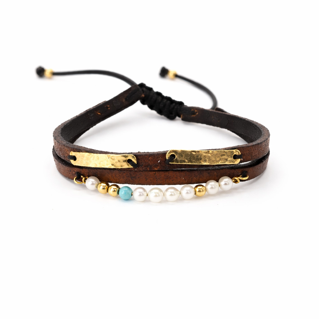 Doğal dokuların sıcaklığı ile zarif detayların buluştuğu bu özel bileklik, deri yüzeyi ve altın plakalarıyla güçlü bir karakter sunar. İnci dizilimi ve ortadaki turkuaz tonlu taş detayı, tasarıma ferah ve sofistike bir dokunuş katarken, bilekliğe dengeli bir estetik kazandırır. Ayarlanabilir yapısı sayesinde farklı bilek ölçülerine uyum sağlayarak konforlu bir kullanım sunar. Günlük stilinize doğal ve dikkat çekici bir şıklık eklemek için ideal bir parçadır.