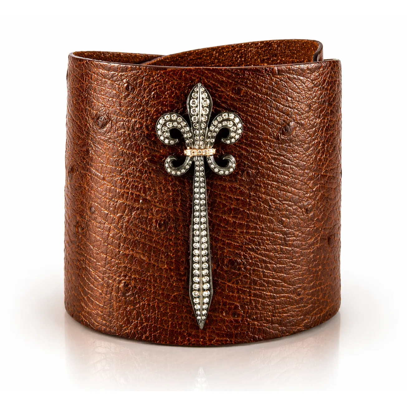 El İşçiliği Deri Bilezik – Renkli Pırlanta Taşlı Fleur-de-Lis Motifli Geniş Bileklik