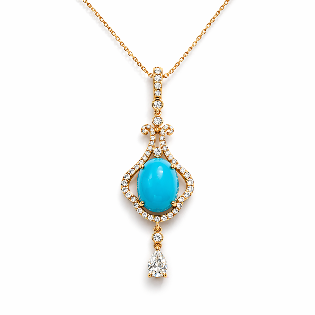 Canlı turkuaz tonuyla öne çıkan bu firuze taşlı kolye, merkezde yer alan oval kesim taş ile dikkat çeker. Etrafını saran pırlanta detaylar, taşın rengini daha belirgin hale getirirken tasarıma ışıltılı bir çerçeve kazandırır.