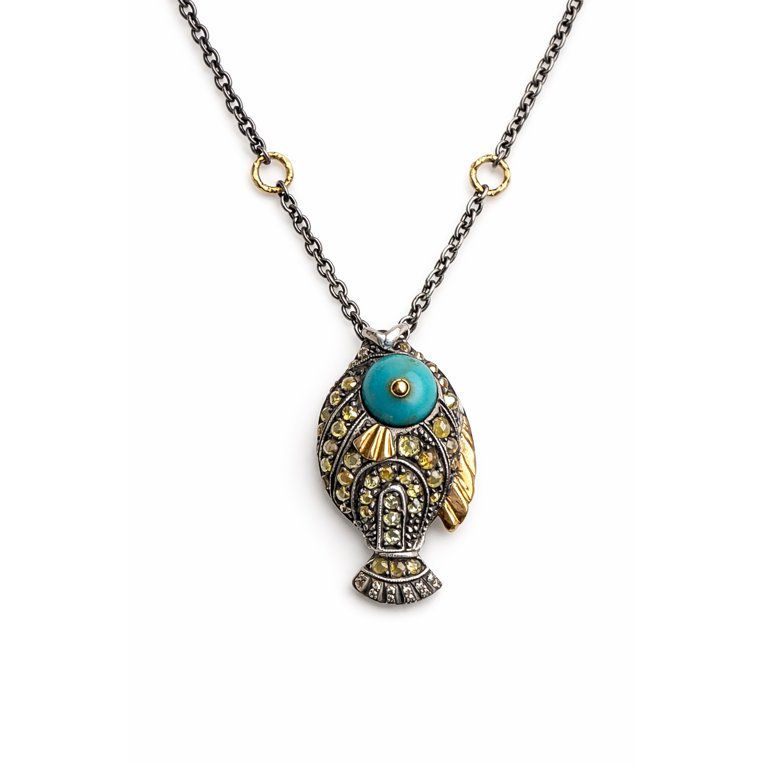 Zarif balık motifi, bu özel tasarım kolyede firuzenin canlı tonları ve vintage dokularla birleşerek dikkat çekici bir estetik sunuyor. Üzerindeki ince işçilikle yerleştirilmiş taş detayları ve altın dokunuşlar, kolyeye hem hareket hem de ışıltı kazandırır. Balık figürü; bereket, akış ve özgürlüğü simgelerken, firuze taşı ise koruyucu enerjisiyle bilinir. Günlük şıklığı anlamlı bir tasarımla tamamlamak isteyenler için özgün ve karakterli bir parça.