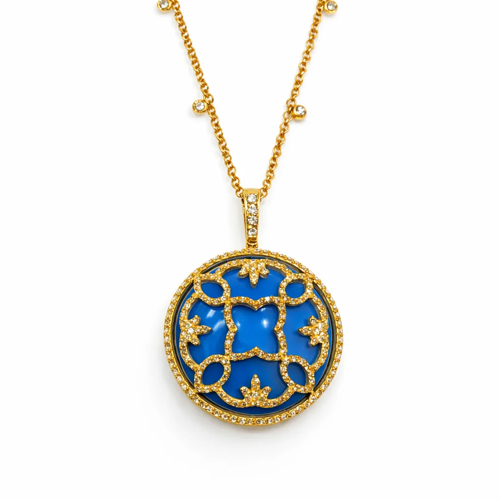 Canlı firuze tonuyla öne çıkan bu kolye, altın detaylar ve çevresini saran pırlantalarla dikkat çekici bir görünüm sunar. Ortadaki desenli form tasarıma hareket katarken, yuvarlak çerçeve yapısı parçaya dengeli ve zarif bir duruş kazandırır. Günlük kullanımda renkli bir vurgu yapmak ya da özel anlarda güçlü bir tamamlayıcı tercih etmek için ideal bir parçadır.
