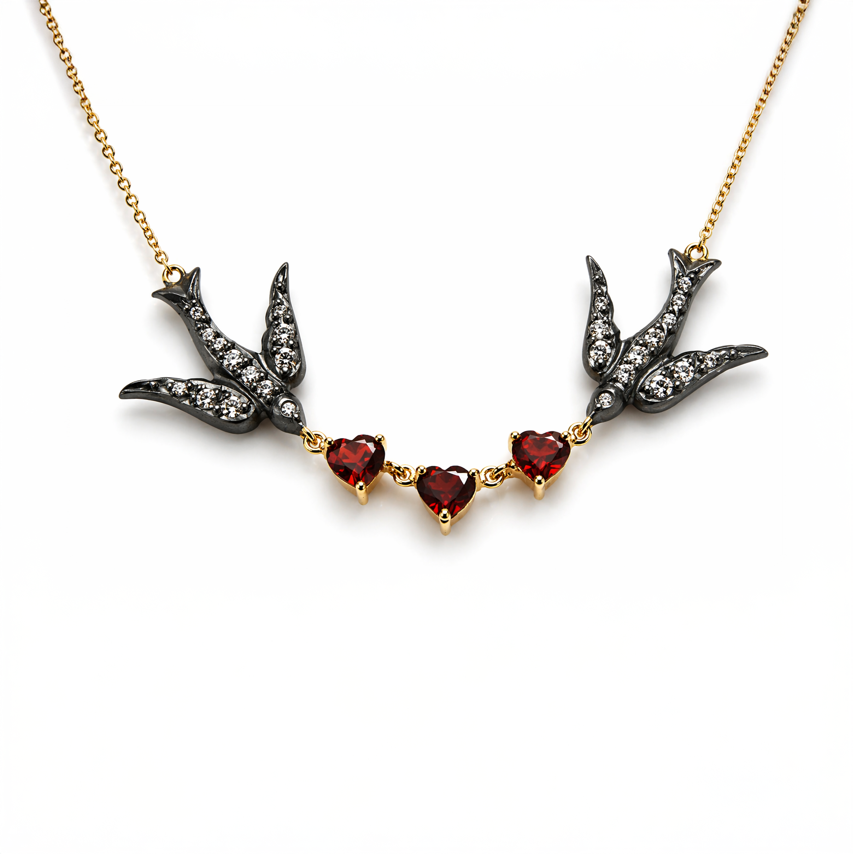 Kırlangıç kuşunun zarif ve özgür ruhunu yansıtan bu özel kolye, derin kırmızı tonlara sahip granat taşlarla dikkat çeker. Siyah rodyum kaplama kuş figürleri üzerindeki pırlanta detaylar tasarıma ince bir ışıltı katarken, ortada yer alan kalp form granat taşlar güçlü bir vurgu oluşturur. Altın zincir ile tamamlanan yapı, farklı renk ve dokuların dengeli uyumunu sunar. Hareketli formu sayesinde boyunda estetik bir duruş sergileyen bu parça, günlük stilinize karakter katar ve özel anlarda dikkat çekici bir tamamlayıcı olur. Anlam ve estetiği bir araya getiren özgün bir tasarımdır.