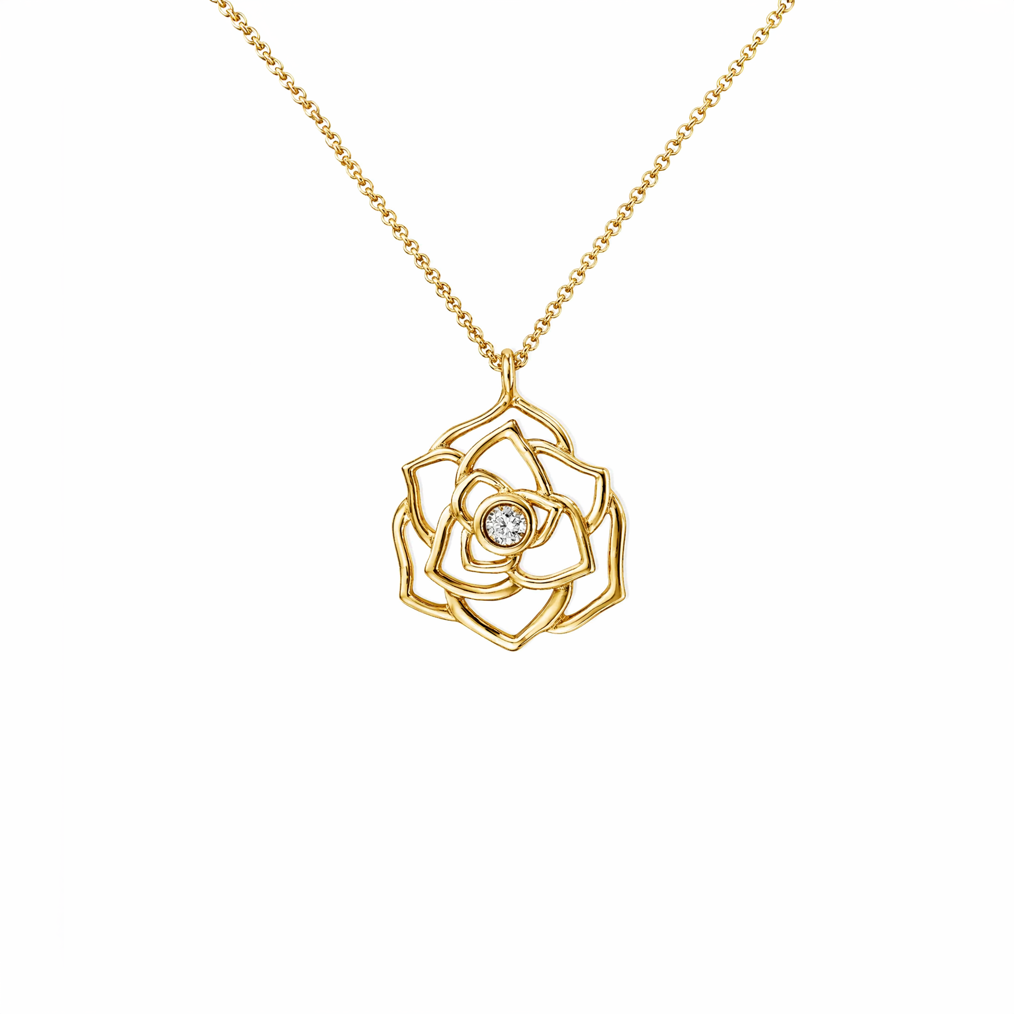 Zarafetin ve aşkın sembolü olan gül formundan ilham alan bu şık kolye, modern tasarım anlayışıyla yeniden yorumlanmıştır. Katmanlı gül formu, ince altın çizgilerle oluşturularak hafif ve estetik bir görünüm sunarken, merkezde yer alan pırlanta detayı ışıltılı bir vurgu yaratır.