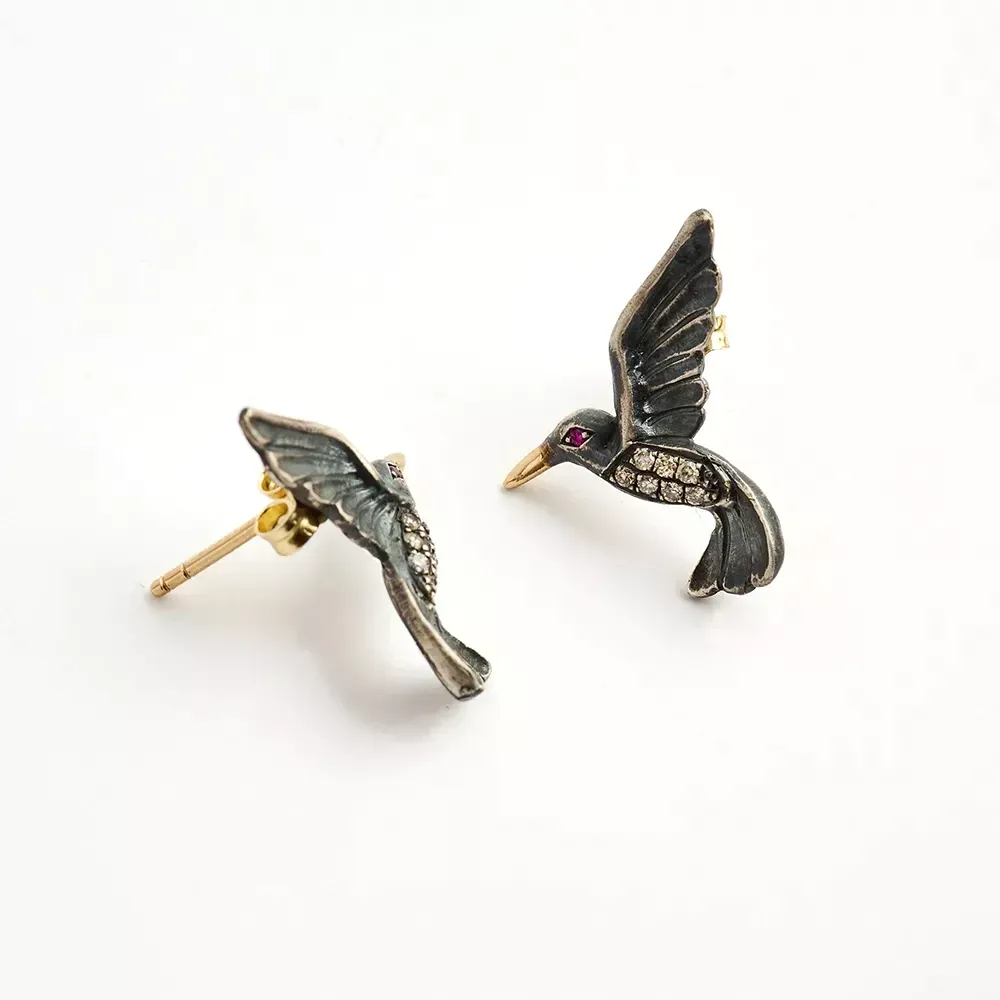 Zarafetin ve özgürlüğün simgesi olan sinek kuşundan ilham alan bu özel küpeler, ince detayları ve sanatsal işçiliğiyle öne çıkar. Kanat formundaki dokulu yüzeyler, gövdedeki taş detayları ve dikkat çekici tasarımıyla her açıdan estetik bir duruş sunar.