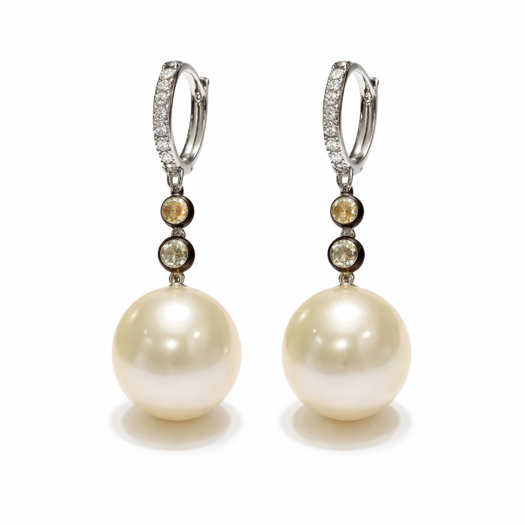 Büyük boy inci detayıyla öne çıkan altın küpe, üst kısmındaki pırlanta taşlar ve sarı tonlu taş geçişleriyle zengin bir görünüm sunar. Hareketli yapısı ve dengeli tasarımı sayesinde klasik inci küpeleri farklı bir yorumla sunan dikkat çekici bir parçadır.