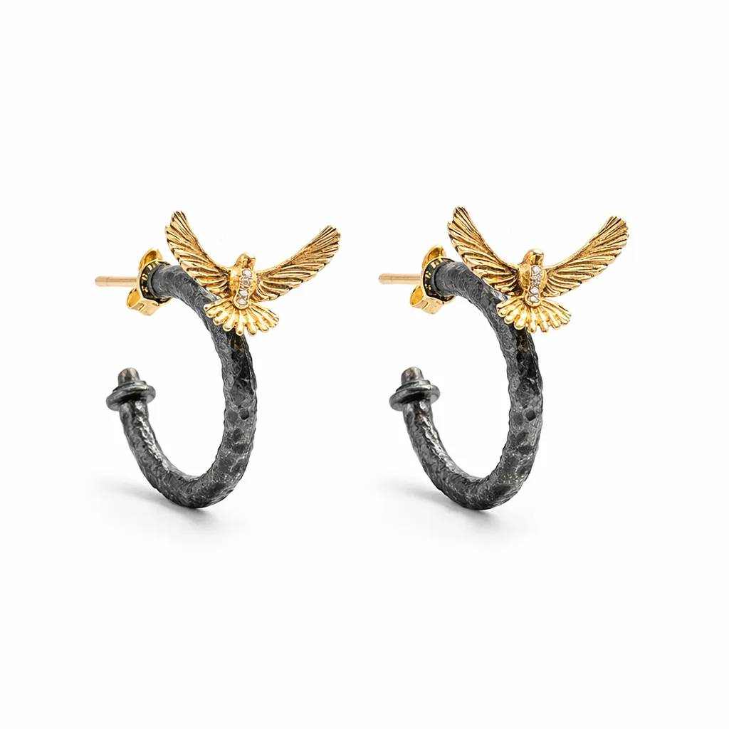 Oksit gümüş halka form üzerine konumlandırılan altın ton kartal figürü ve pırlanta detaylarıyla tasarlanan bu küpe, güçlü ve özgün bir stil sunar. Dokulu yüzeyi ve dikkat çekici figürü sayesinde modern ve iddialı kombinlerin tamamlayıcı parçası olur.