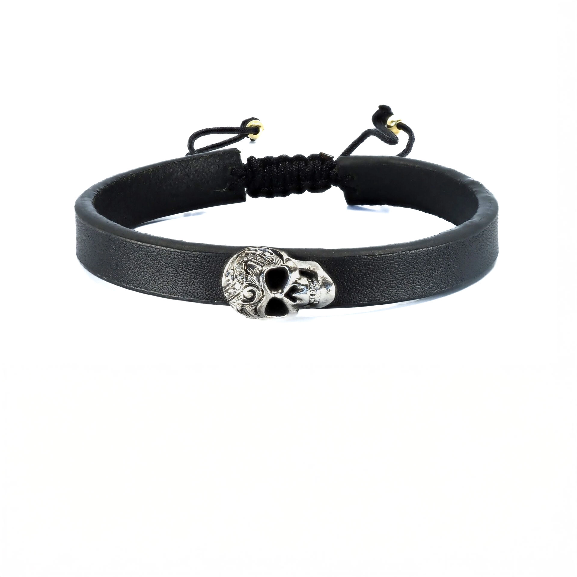 Siyah deri bant üzerine yerleştirilen kuru kafa detayıyla öne çıkan bu bileklik, cesur ve karakterli bir stil sunar. Metal işçiliğiyle hazırlanan kafatası formu, tasarıma güçlü bir ifade katarken ayarlanabilir bağlama detayı konforlu kullanım sağlar. Günlük kombinlerde dikkat çekici bir aksesuar olarak öne çıkan bu parça, modern ve iddialı tarzı tamamlamak isteyenler için ideal bir seçimdir.