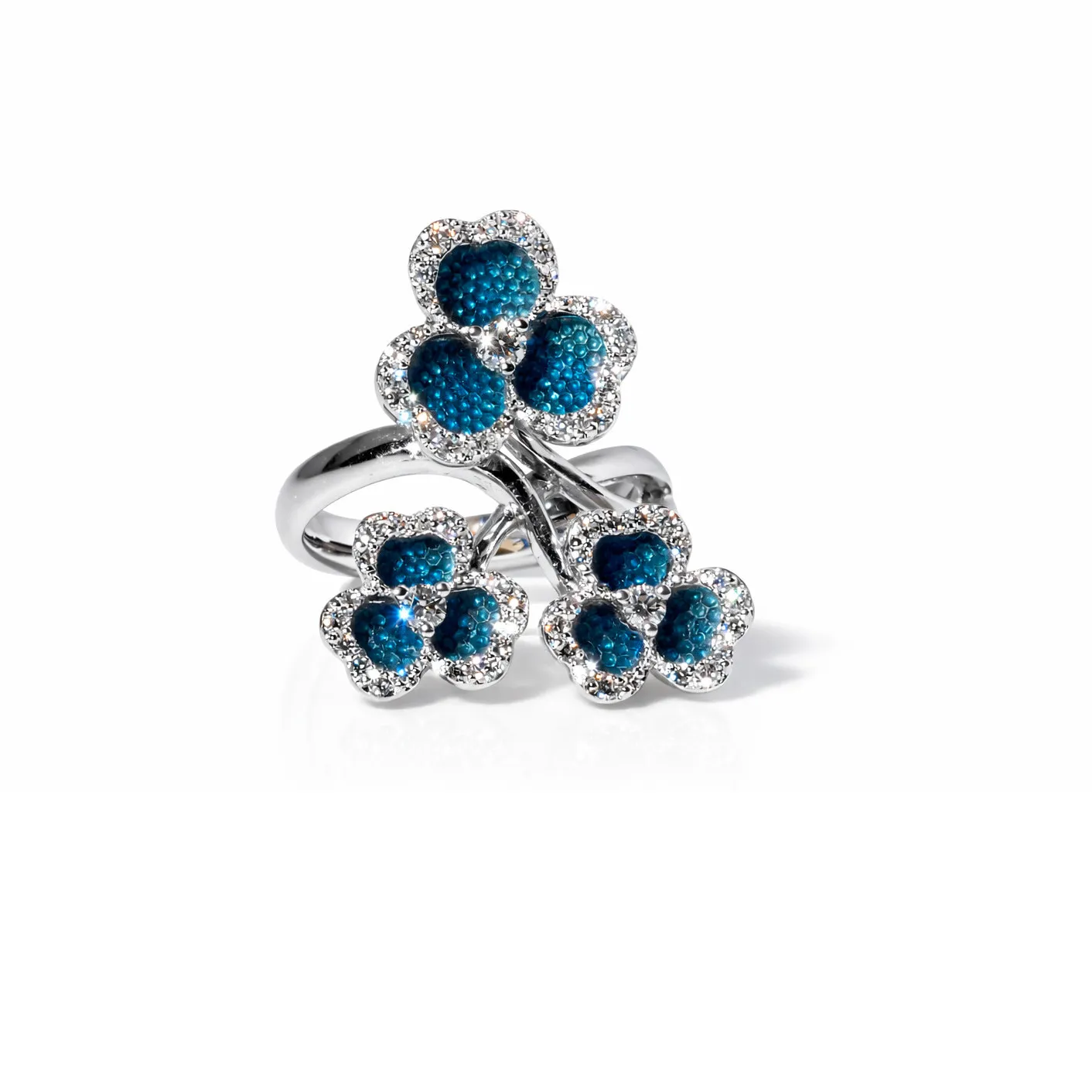 Mavi mine detayları ve pırlanta taşlarla süslenen çiçek form tasarımıyla bu altın yüzük, zarif ve göz alıcı bir şıklık sunar. Doğadan ilham alan modern ve feminen bir tasarım olarak öne çıkar.