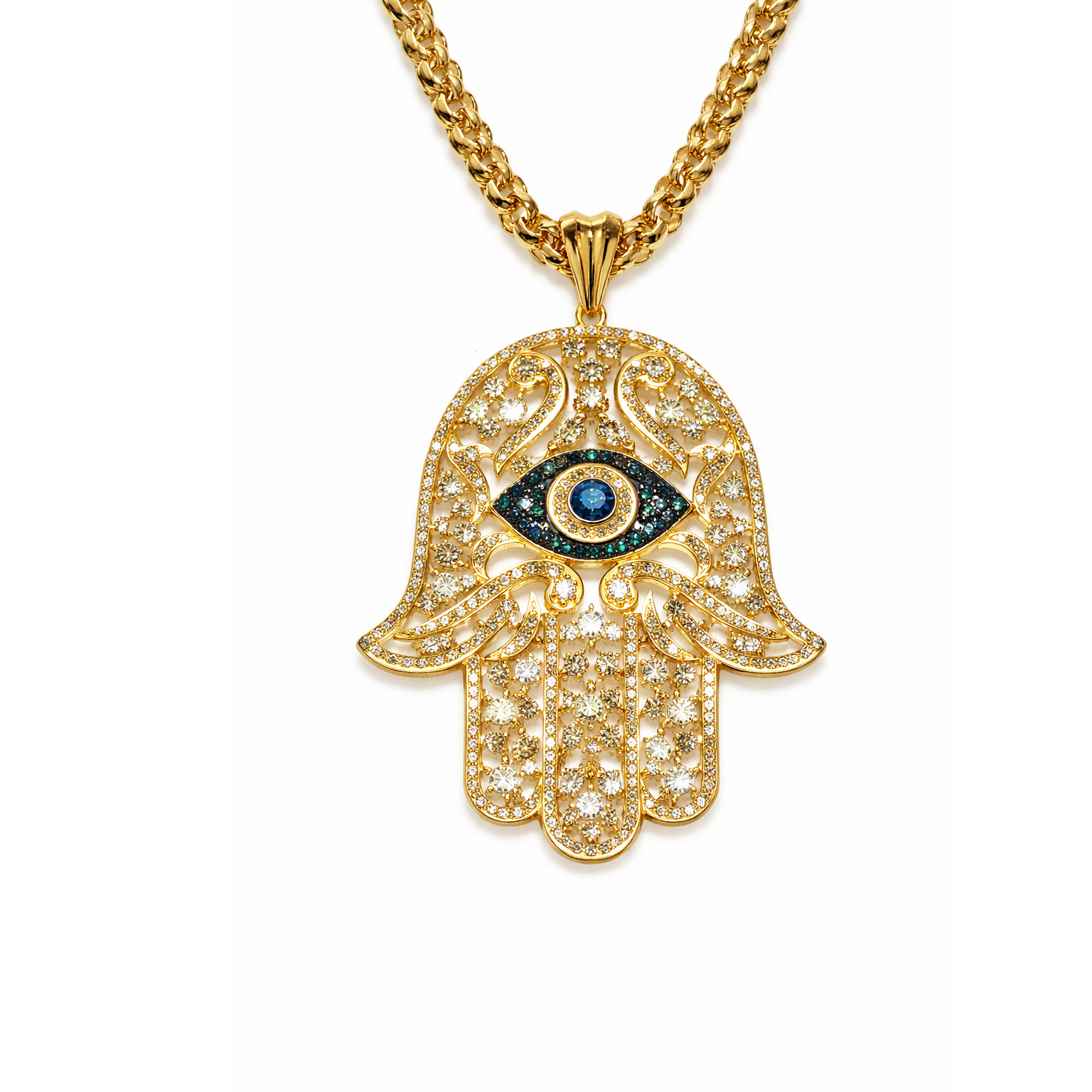 Geleneksel sembolizmi modern tasarım anlayışıyla buluşturan bu özel kolye, mavi ve beyaz pırlantaların ışıltısıyla dikkat çeker. Fatma Ana Eli formu, zarif detaylarla işlenmiş altın yüzey üzerinde güçlü bir koruma ve şans sembolü olarak öne çıkar. Ortadaki göz formunda yer alan mavi pırlanta, beyaz pırlantalarla çevrelenerek derinlik ve anlam katarken, tasarımın tamamına sofistike bir denge kazandırır. Günlük kullanımdan özel davetlere kadar stilinize anlam ve zarafet ekleyen zamansız bir parçadır.