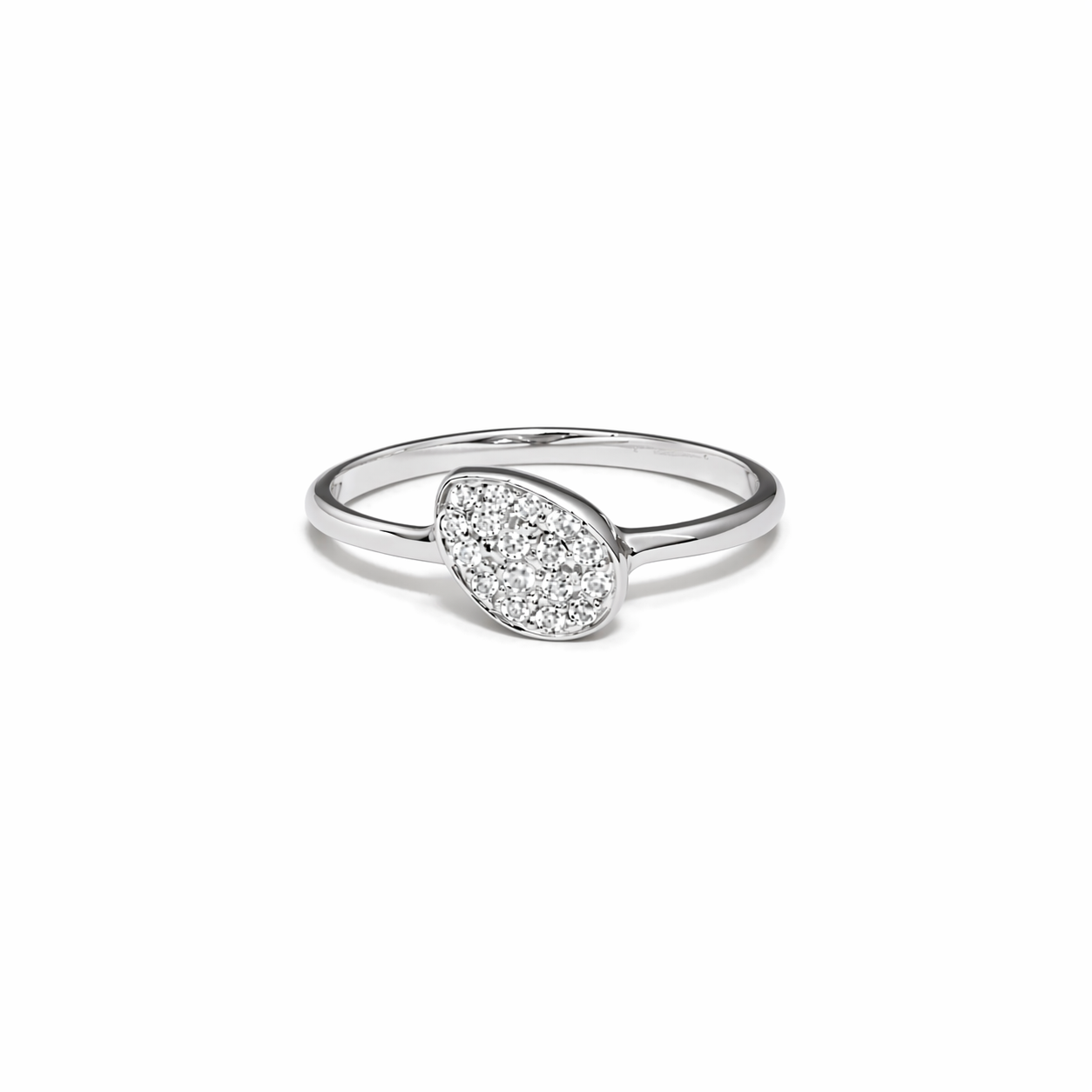 Modern zarafeti yansıtan bu yüzük, damla formunda yerleştirilmiş pırlanta taşları ile göz alıcı bir ışıltı sunar. Beyaz altının sade ve sofistike tonu, pırlantaların parlaklığını ön plana çıkararak şık ve zamansız bir görünüm oluşturur.