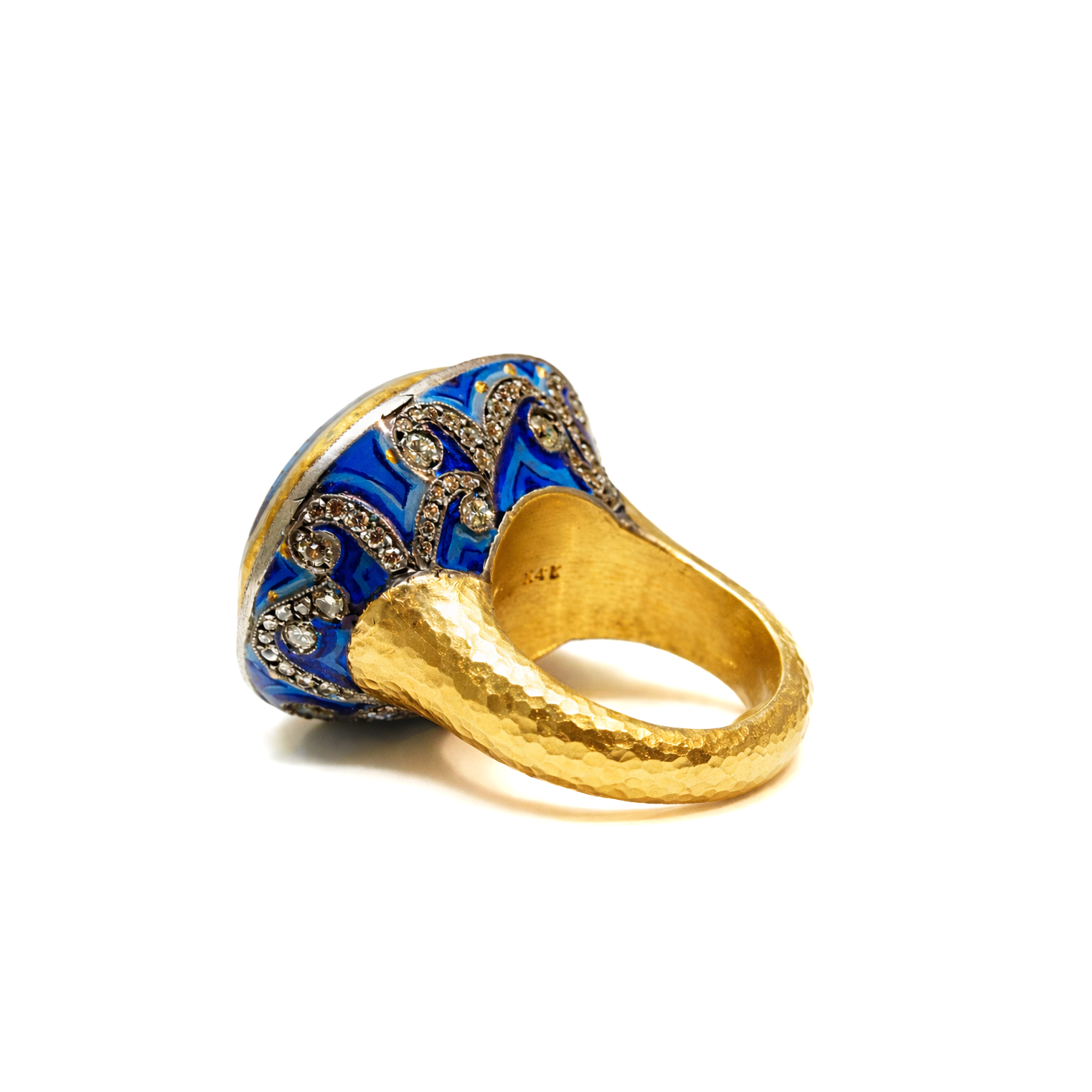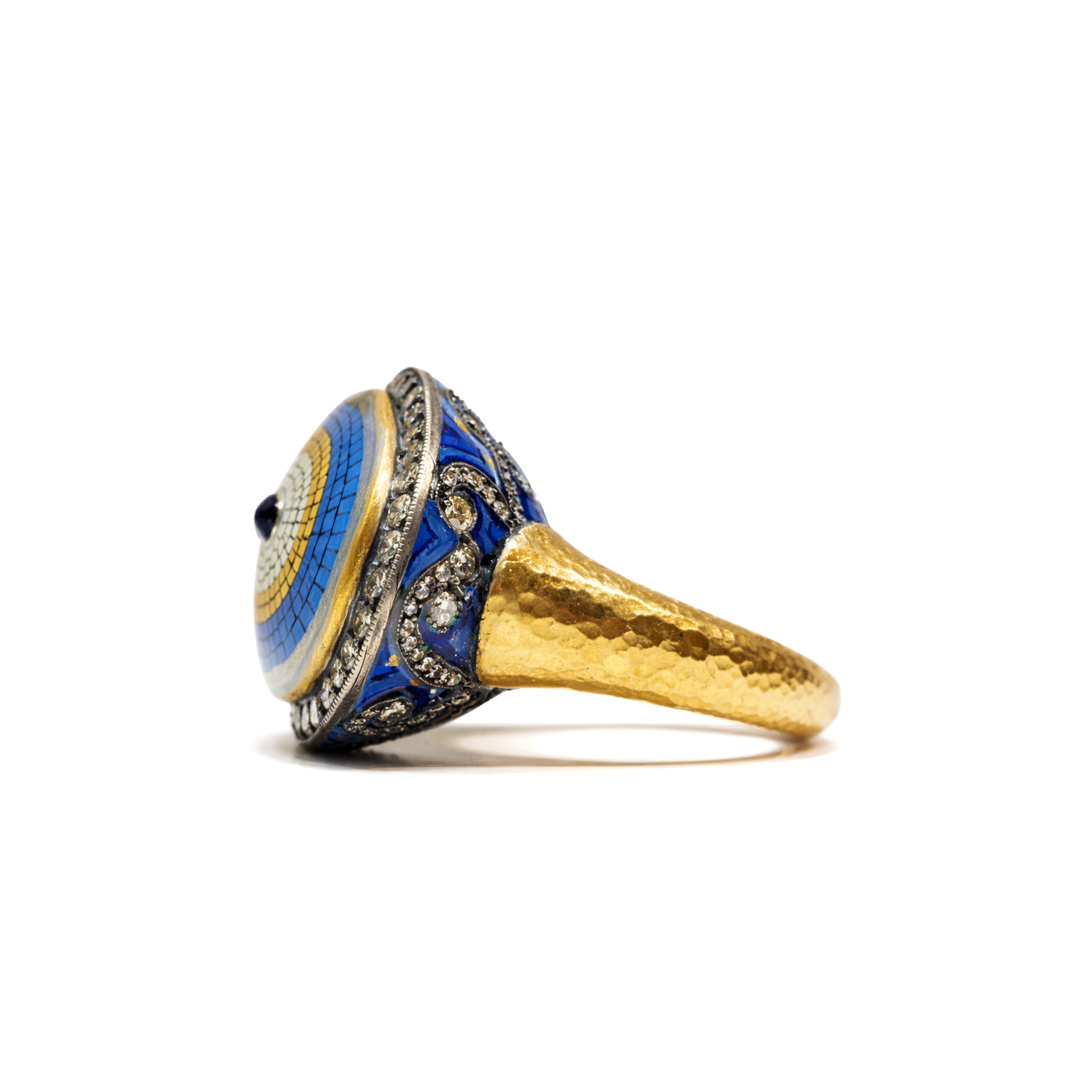 Göz alıcı mozaik işçiliğiyle tasarlanan nazar motifi, bu yüzükte güçlü bir görsel etki yaratır. Mavi, beyaz ve altın tonlarının katmanlı yapısı, merkezde yer alan koyu taş detayıyla derinlik kazanır. Çevresini saran pırlanta dizilimi ışığı zarif bir şekilde yansıtırken, altın yüzük formu tasarıma sıcak bir denge katar. Dikkat çekici ve anlam yüklü bir parça arayanlar için özel bir seçimdir.