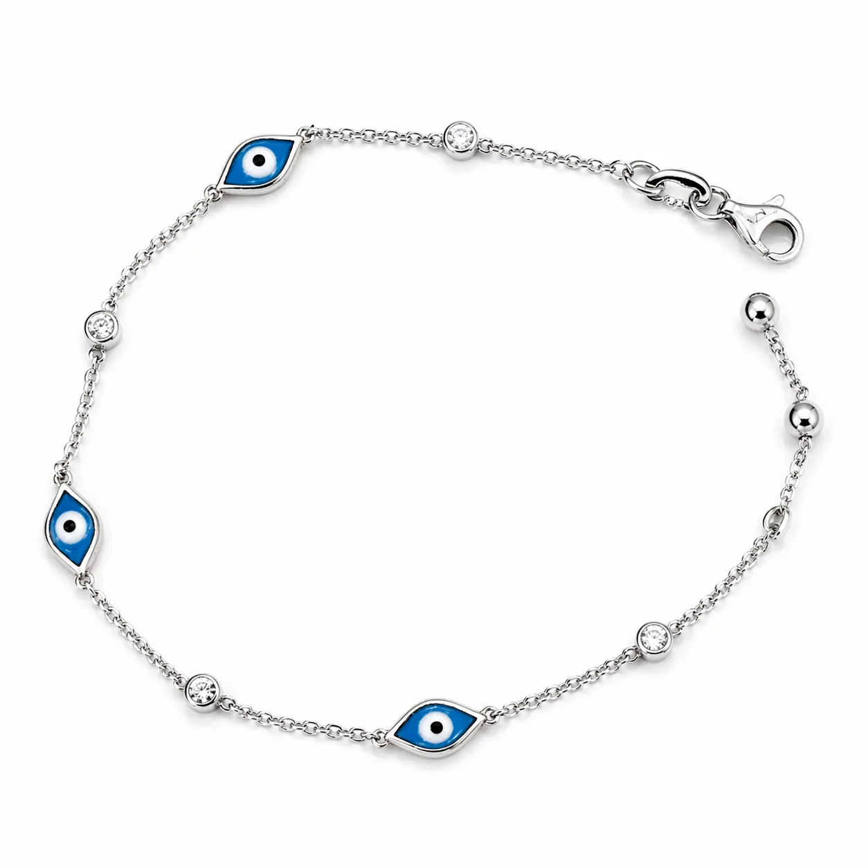 İnce zincir üzerine yerleştirilen göz formundaki nazar boncukları ile tasarlanan bu nazar boncuklu bileklik, modern ve anlamlı bir görünüm sunar. Mavi-beyaz tonlardaki göz figürleri, bileklik boyunca dengeli şekilde konumlandırılmıştır.
