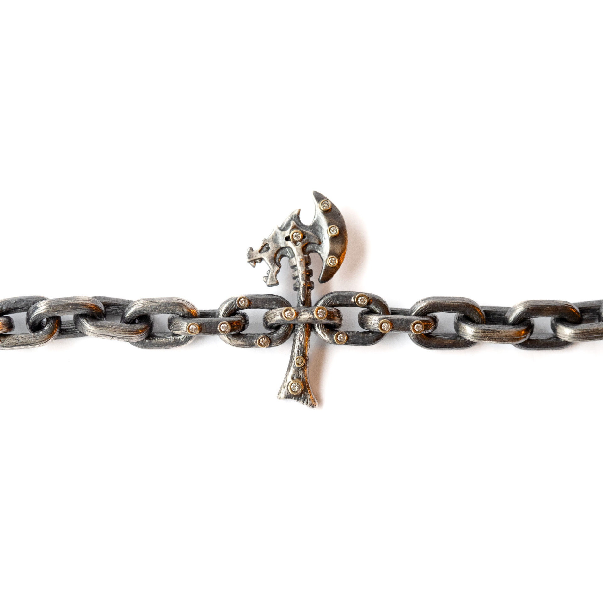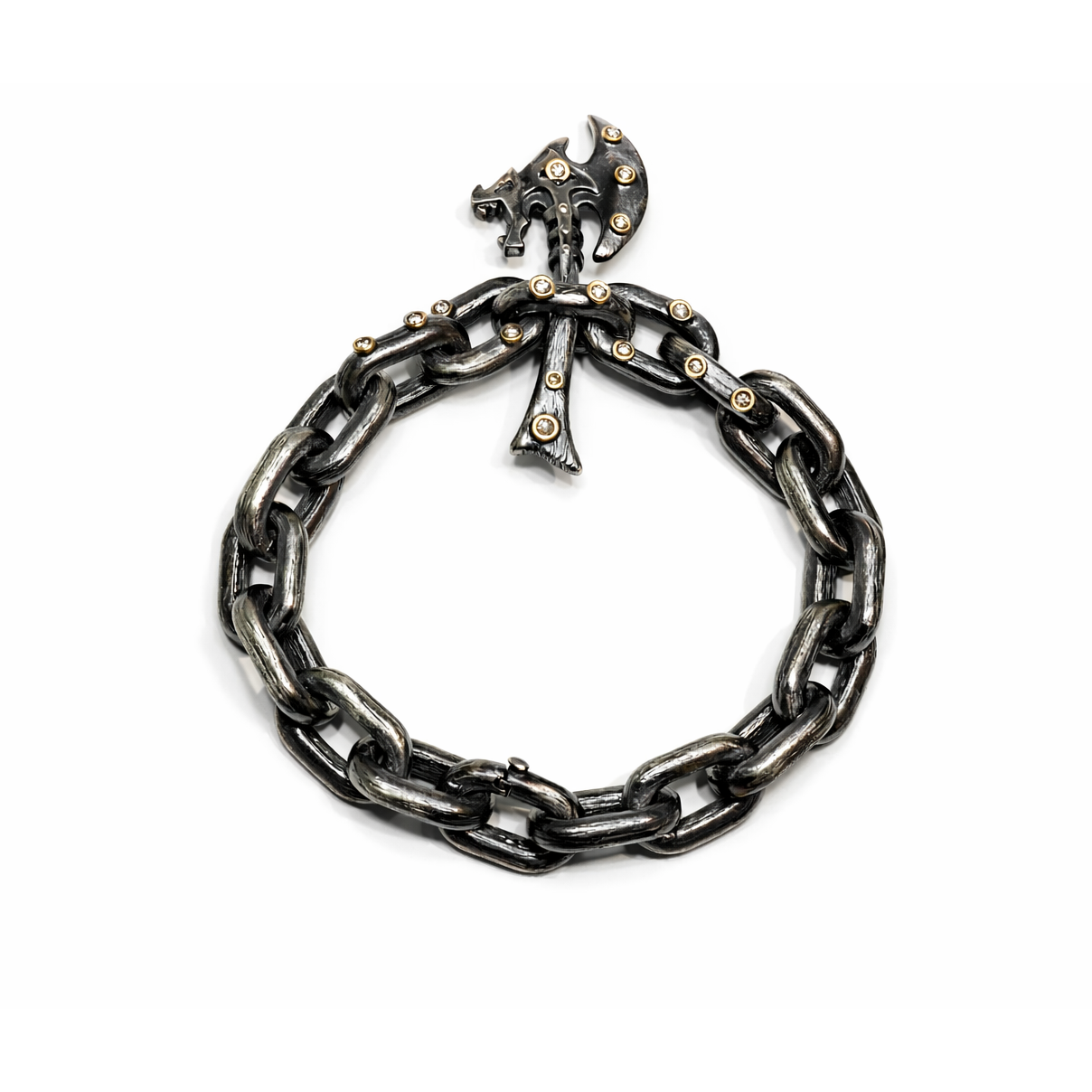 Kalın zincir formu ve güçlü detaylarıyla öne çıkan bu bileklik, dikkat çekici bir stil sunar. Okside gümüş yüzey, tasarıma derin ve karakterli bir görünüm kazandırırken altın yuvalar içinde yer alan pırlanta detaylar bilek üzerinde ince bir ışıltı oluşturur. Özgün kapama tasarımı ve bütünlüklü yapısı sayesinde güçlü bir duruş sergiler. Günlük stiline iddialı bir dokunuş katmak ya da kombinlerini öne çıkarmak isteyenler için etkili bir aksesuardır.