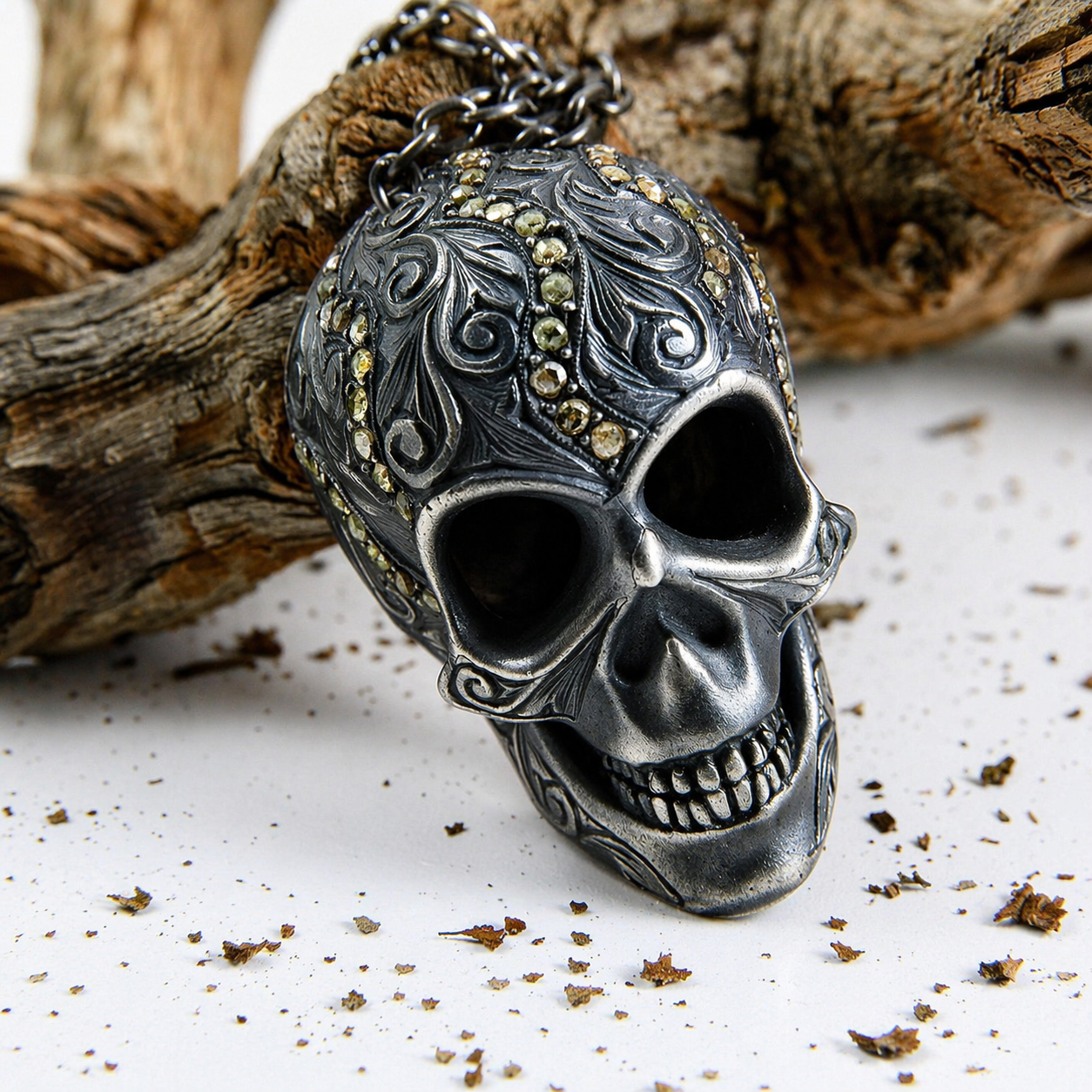 Gotik estetiği modern dokunuşlarla yeniden yorumlayan bu özel parça, klasik kurukafa figürünü lüks bir mücevher formuna dönüştürür. El işçiliği hissi veren detaylar ve taşların ışıkla buluşması, kolyeyi güçlü bir stil ifadesine dönüştürür.