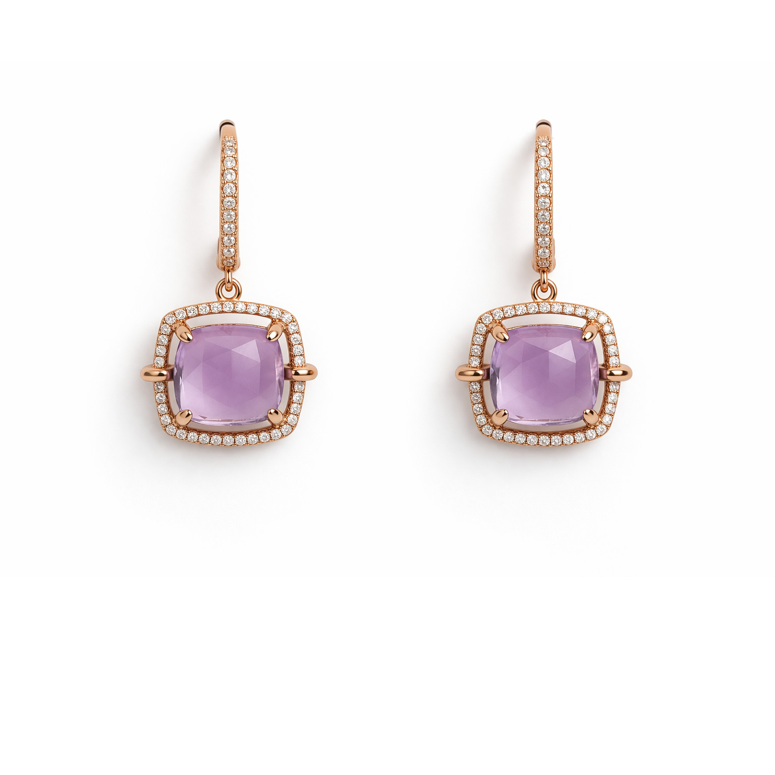 Pembe Ametist Taşlı, Pırlanta Çerçeveli Altın Küpe
