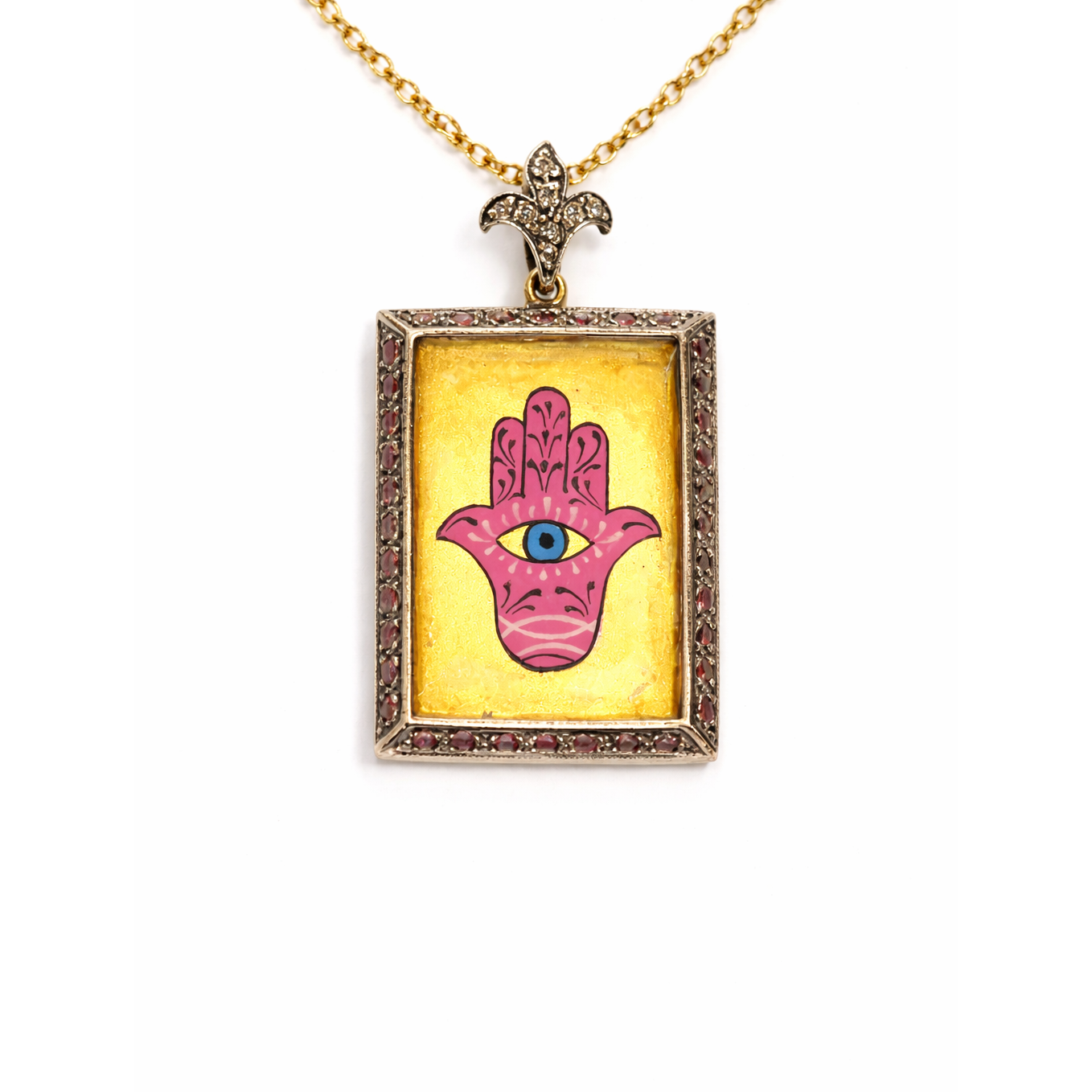 Canlı renklerin enerjisiyle yorumlanan bu özel tasarım kolye, Fatma Ana Eli (Hamsa) ve nazar gözü motiflerini modern bir estetikle sunar. Pembe tonlarda işlenen motif, altın zemin üzerinde güçlü bir kontrast yaratarak dikkat çekici bir görünüm oluşturur.
