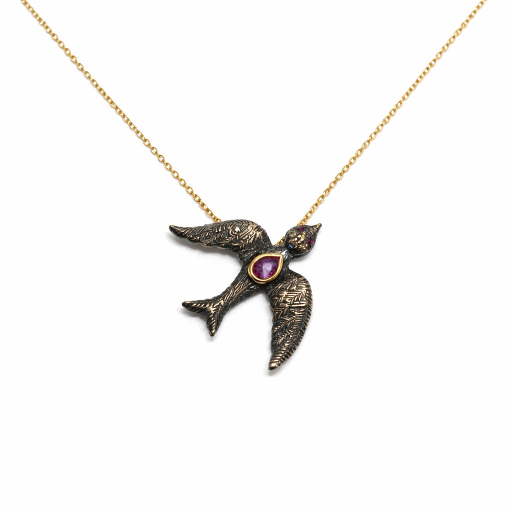Kuş formunda tasarlanan kolye, merkezinde yer alan pembe safir taşı ile öne çıkar. Detaylı yüzey işçiliği ile dikkat çeken özgün bir tasarımdır.