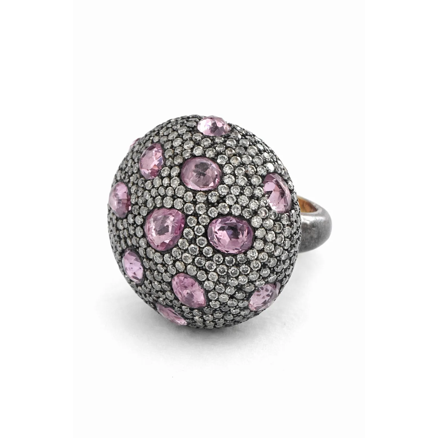 Yoğun pırlanta dizilimiyle ışığı her açıdan yakalayan bu bombeli yüzük, aralara serpiştirilmiş pembe safir taşlarla zarif bir kontrast sunar. Küresel formu sayesinde üç boyutlu ve güçlü bir görünüm elde edilirken, taşların ritmik yerleşimi tasarıma modern bir dinamizm kazandırır.