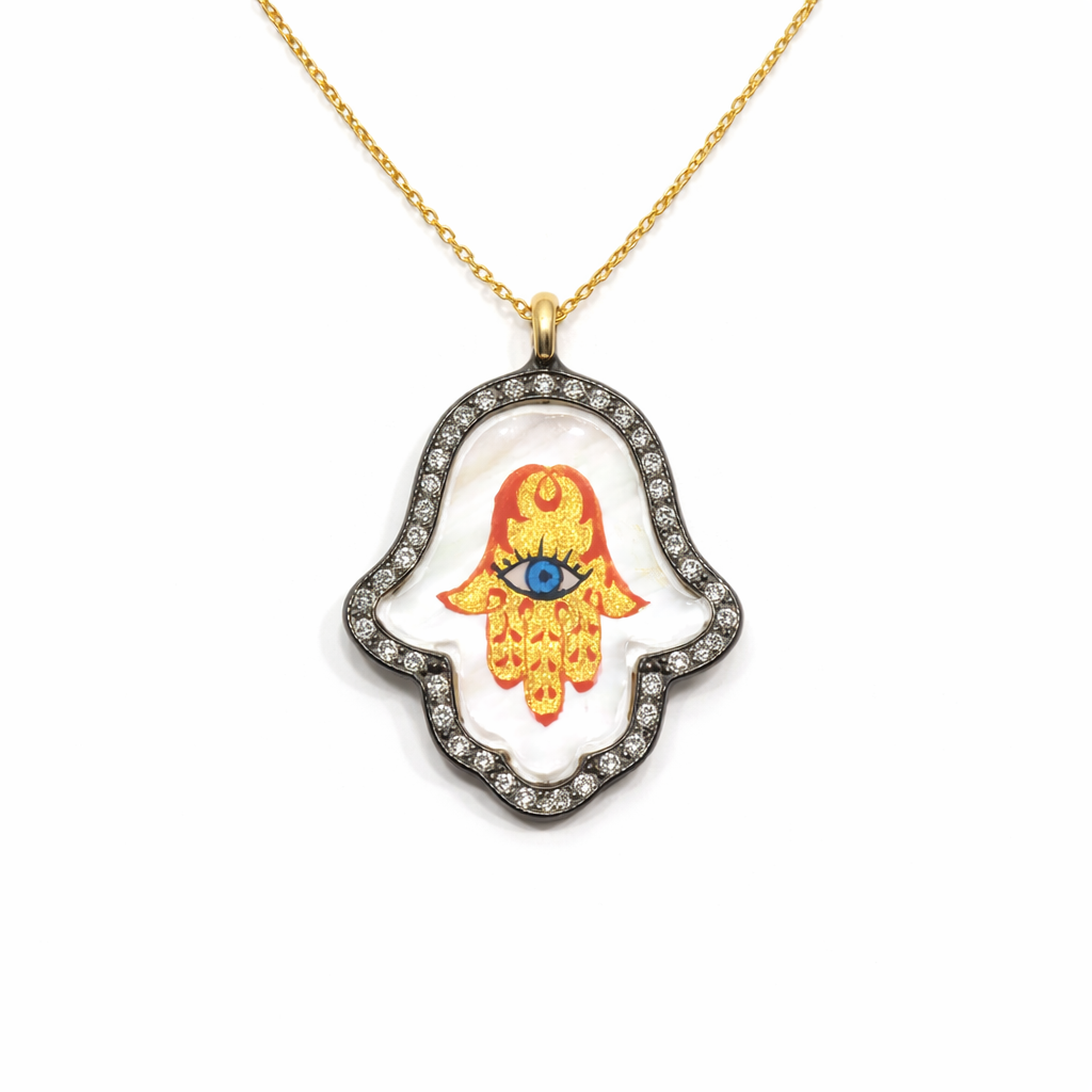 Geleneksel sembolü modern işçilikle buluşturan bu Fatma Ana Eli kolye, mine yüzey ve pırlanta detayların uyumuyla dikkat çeker. Beyaz mine zemin üzerinde yer alan el figürü, canlı renklerle işlenmiş detayları sayesinde güçlü bir görsel etki sunar.