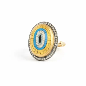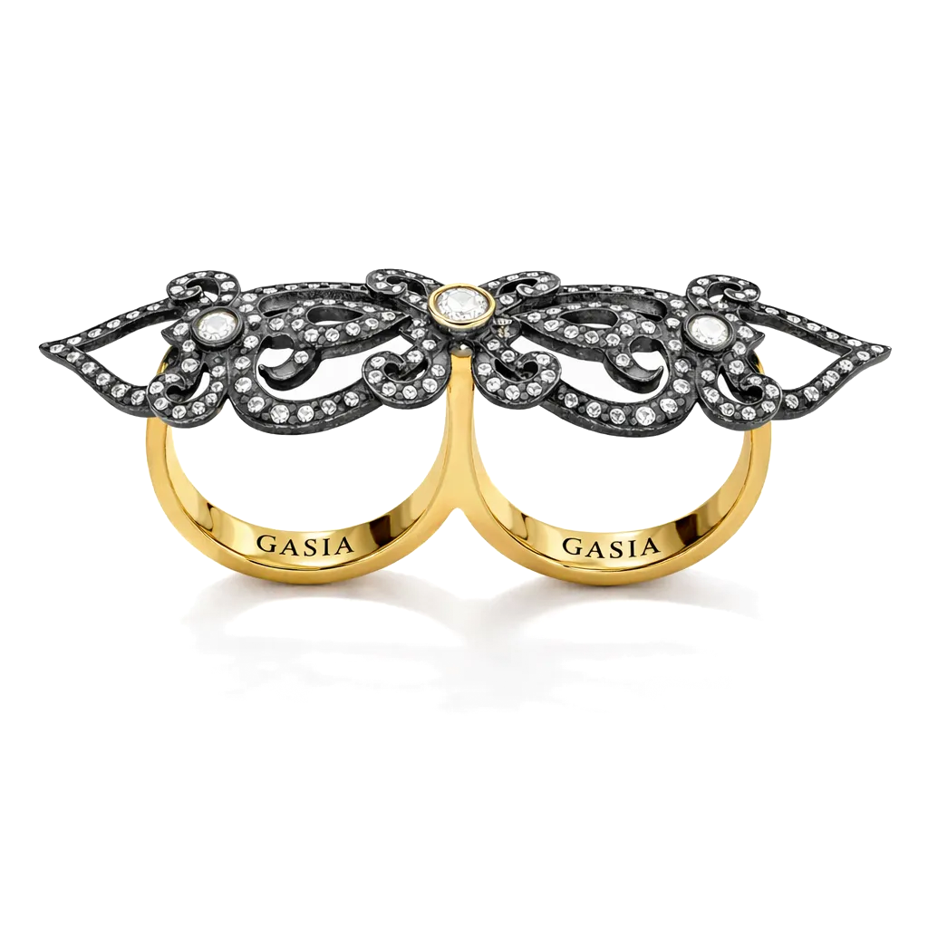 Zarif oyma formu ve etkileyici uzun siluetiyle dikkat çeken bu çift parmak yüzük, tamamen pırlanta taşlarla bezeli detaylarıyla güçlü bir ışıltı sunar. Siyah zemin üzerine yerleştirilen pırlantalar, tasarıma derinlik ve kontrast kazandırırken, altın tonlu gövde ile birleşerek sofistike bir görünüm oluşturur.