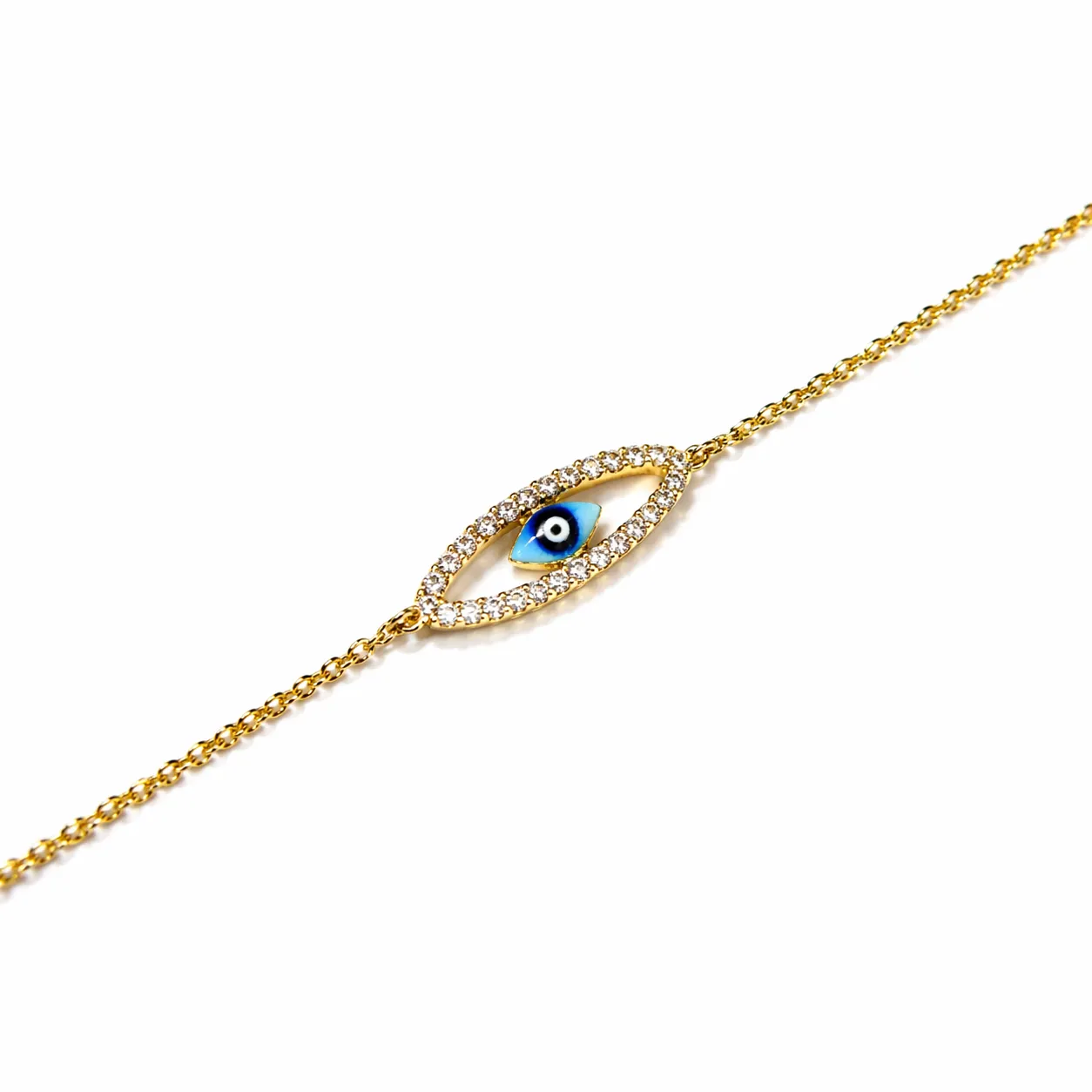 Sarı altının zarif ışıltısı ile tasarlanan bu bileklik, merkezindeki nazar göz motifi ve etrafını saran pırlanta detaylarla dikkat çeker. Oval formdaki tasarım, ince ve dengeli yapısıyla bilekte şık bir duruş sergiler.