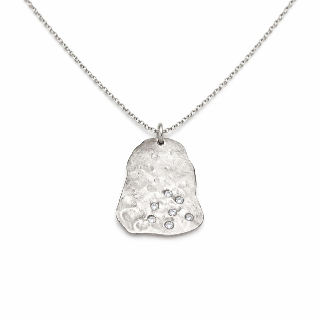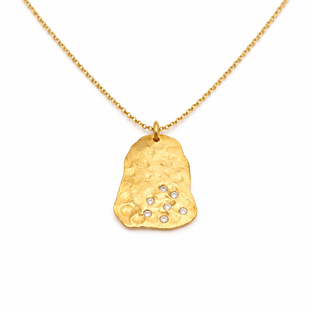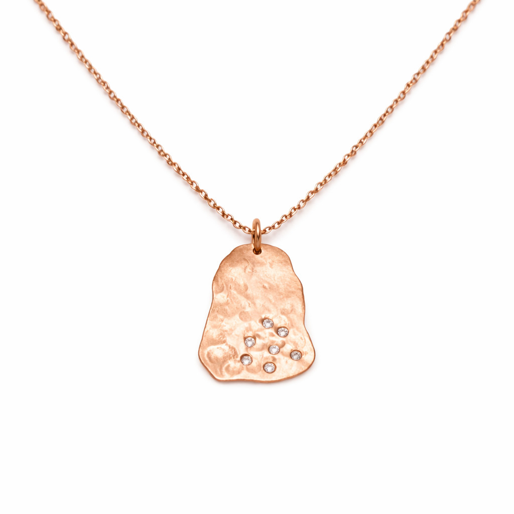 Organik formda tasarlanmış rose altın plaka kolye, yüzeyine yerleştirilmiş pırlanta taşlarla sade ve güçlü bir görünüm sunar.