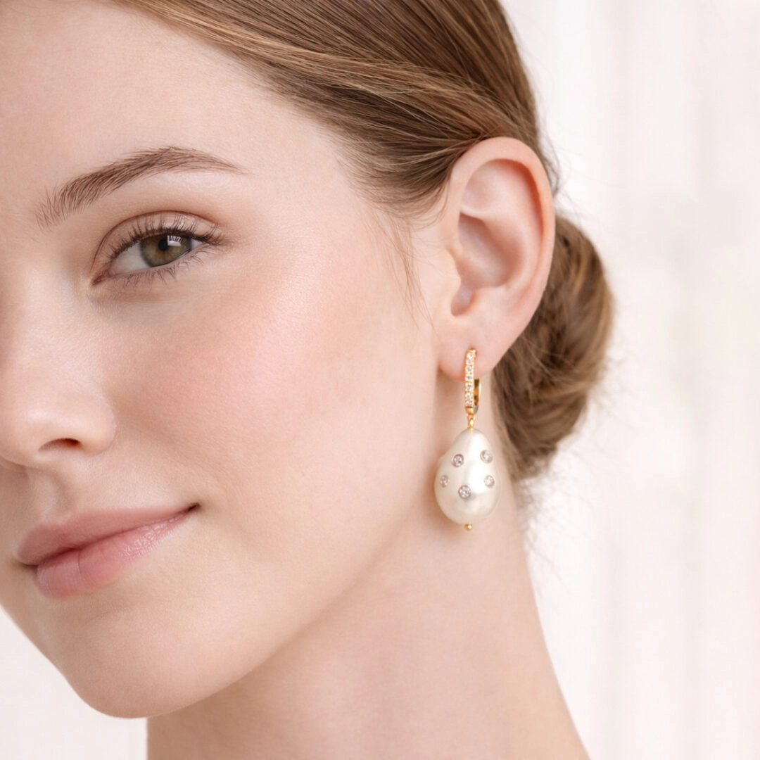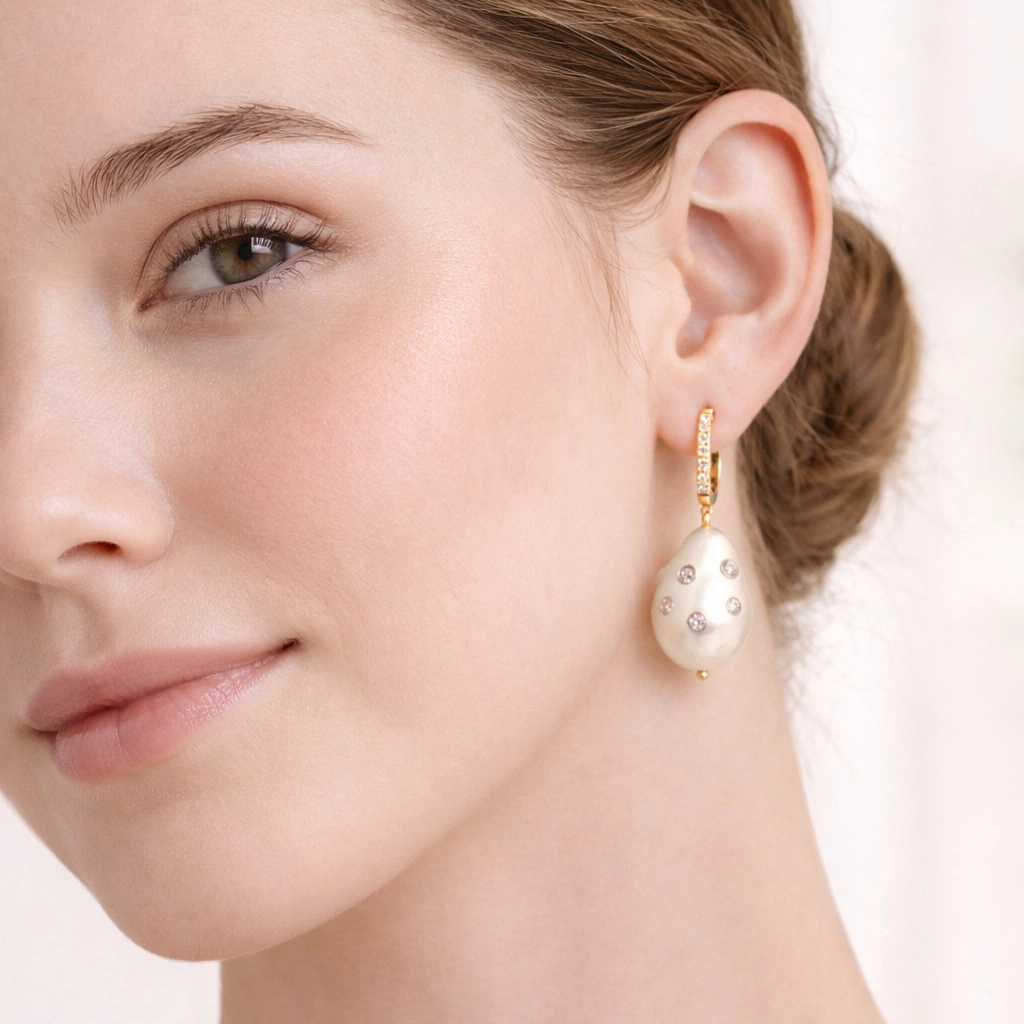 Barok incinin doğal ve benzersiz formu, küpeye sanatsal bir görünüm katarken altın ve pırlanta detaylar lüks bir dokunuş sağlar.