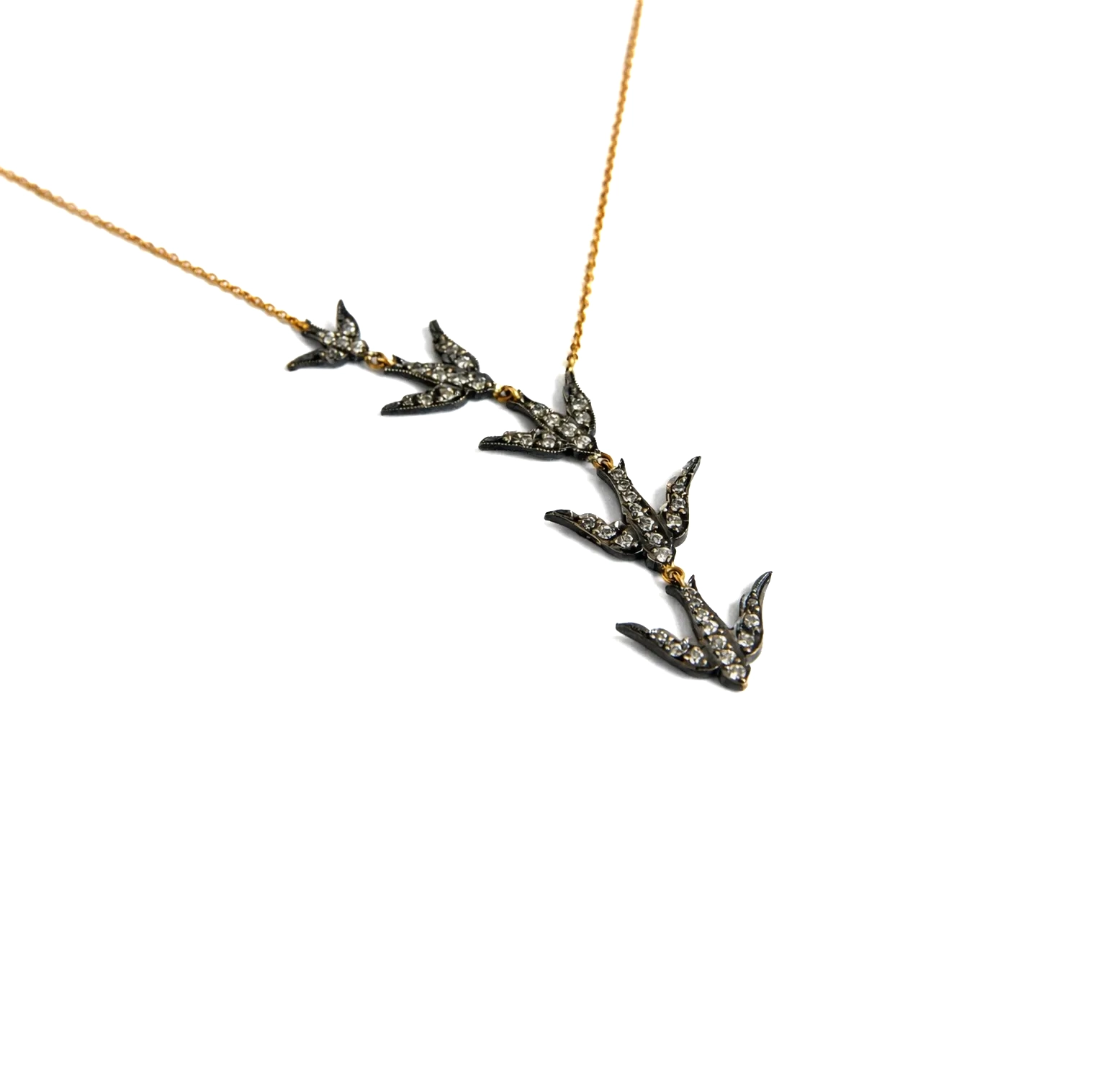 Pırlanta detaylı kuş motiflerinden oluşan altın kolye, zarif ve özgün tasarımıyla dikkat çeken şık bir mücevherdir.