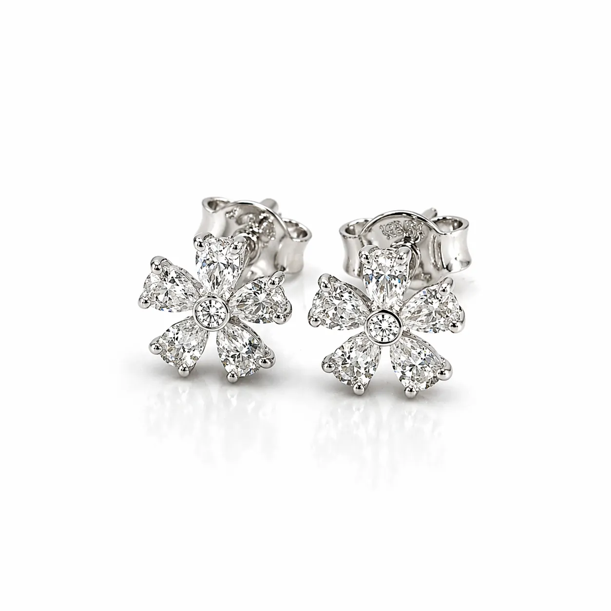 Beyaz altının zarif ışıltısıyla tasarlanan bu küpe, tamamen pırlanta taşlardan oluşan çiçek formuyla göz alıcı bir görünüm sunar. Işığı güçlü şekilde yansıtan pırlantalar, tasarıma yoğun bir parlaklık ve dikkat çekici bir etki kazandırır.